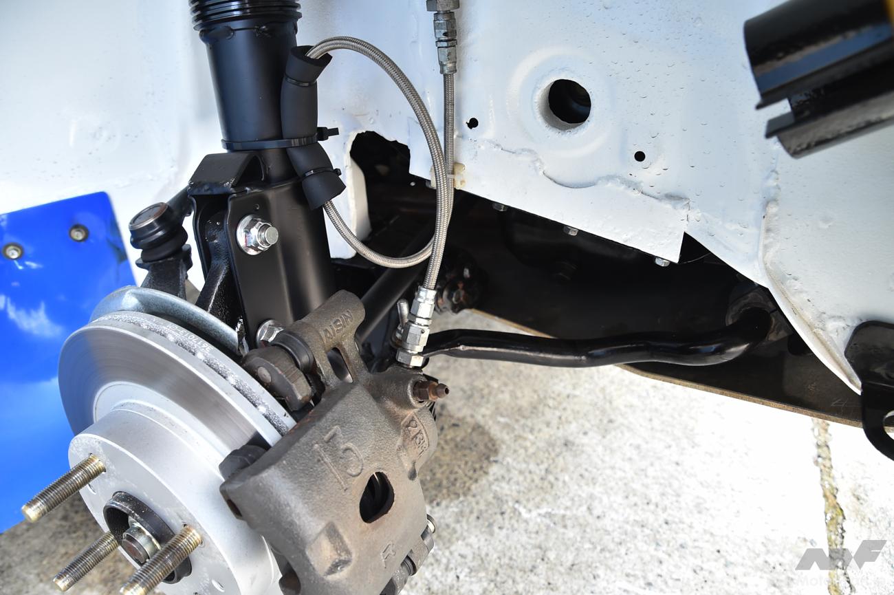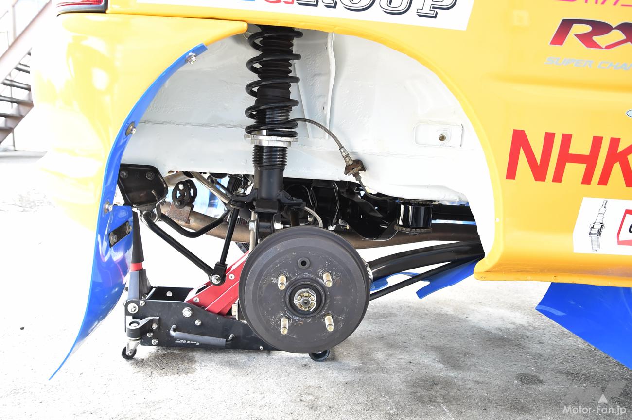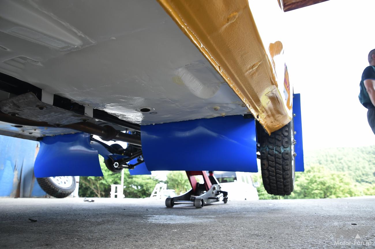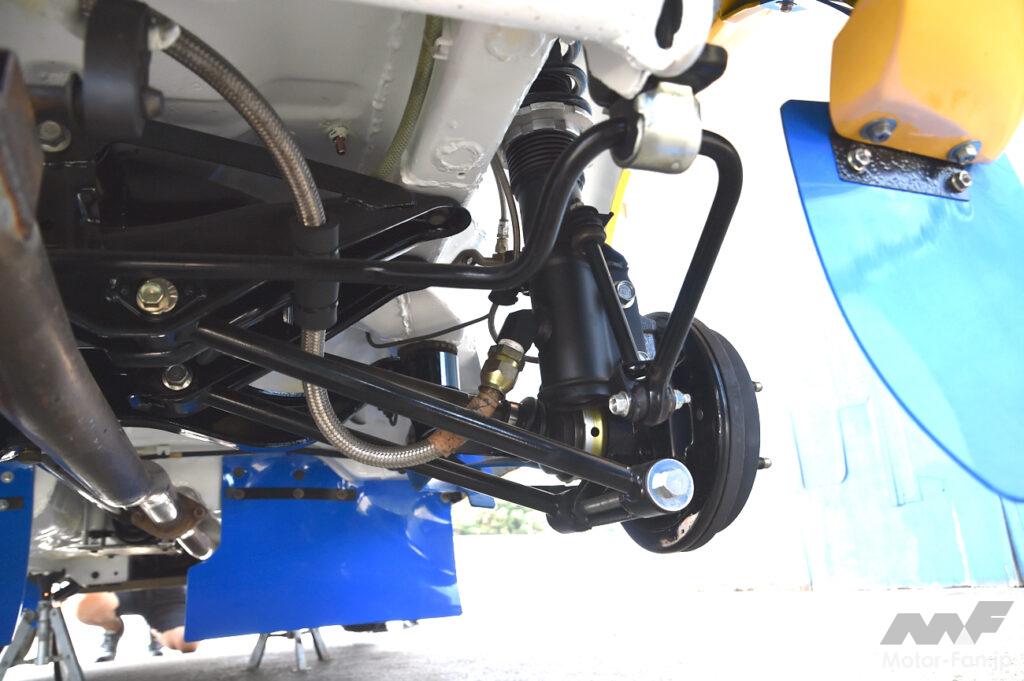 サスペンションはKYBの車高調で、サファリ用の特別仕様を装着。リヤのみ別タンク式になっているのだが、当初はフロントも別タンク式を考えていたことから、フロントのホイールハウス内にはタンク設置用のステーだけが残されていた。