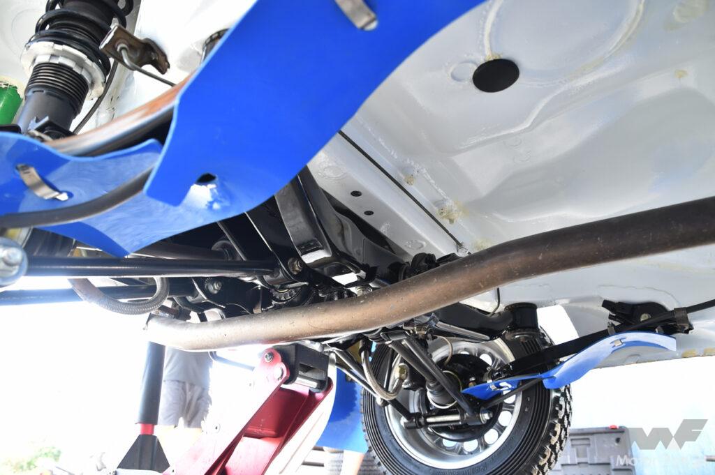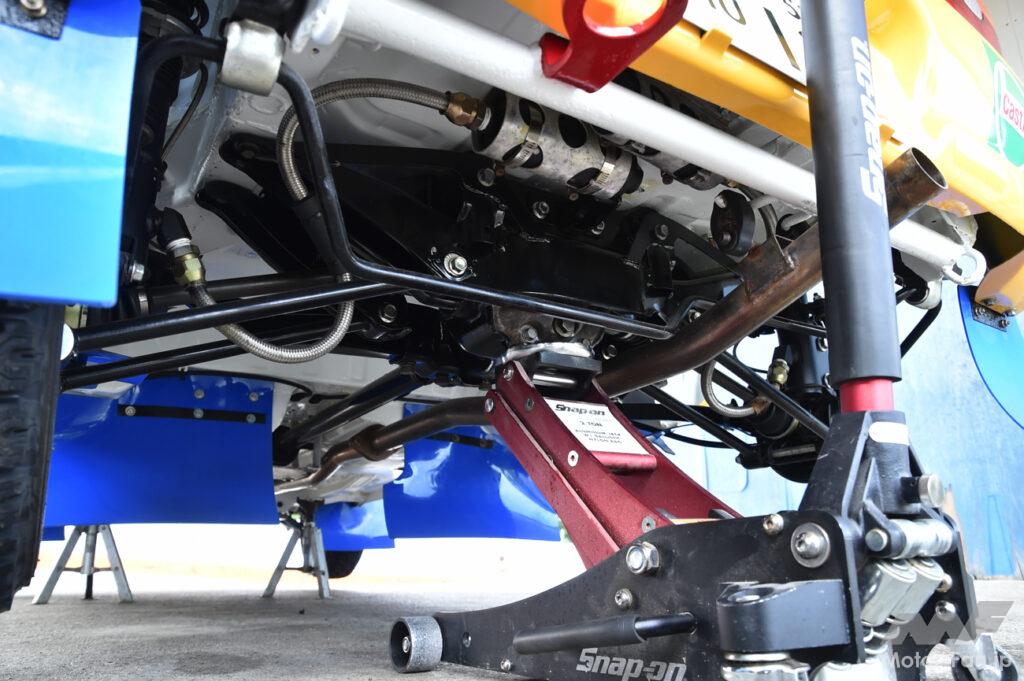 リヤデフにスバル純正LSDを入れているほかは駆動系は基本的にノーマルのまま。トランスミッションも純正の5速MTだ。車体の下を覗くと、リヤデフまわりにはアンダーガードを装着していないのが意外だ。