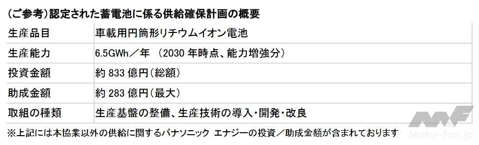 マツダとパナソニック エナジーはかねてより車載用リチウムイオン電池の供給に向けた合意書を締結、中長期的パートナーシップの構築に向けて協議を深めてきたが、2024年9月6日、本協業に関わる電池の生産増強および技術開発に関して、経済産業省より『蓄電池に係る安定供給確保計画』として認定された。マツダは『2030経営方針』に基づいた電動化計画を推進しているが、これにより、同社が2027年以降に導入予定のEV専用プラットフォームを採用した初のバッテリーEV向けに、パナソニック エナジーが生産する次世代円筒形リチウムイオン電池を供給する本格的な準備が開始される。