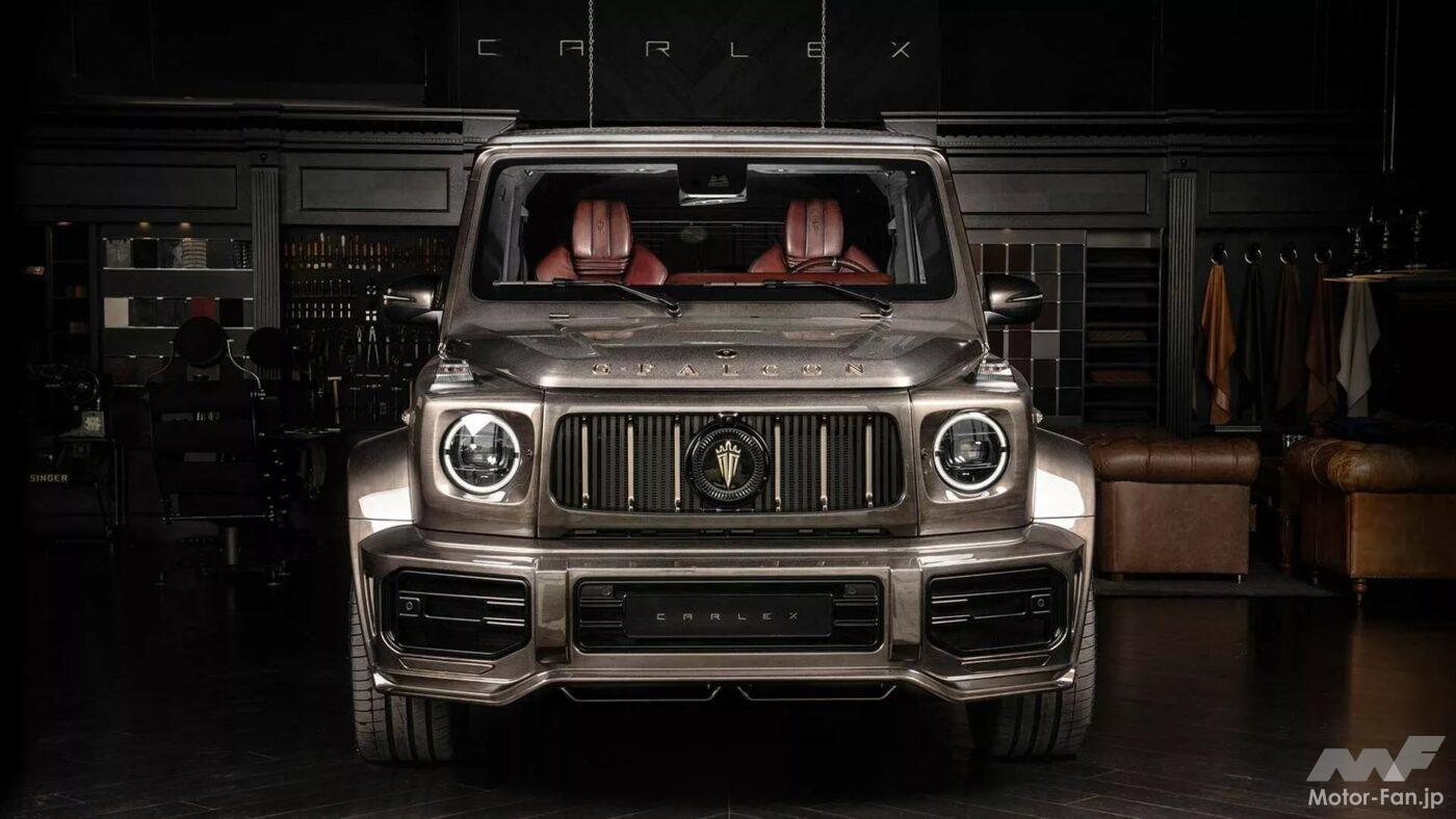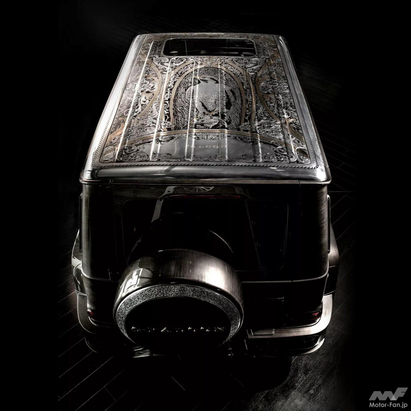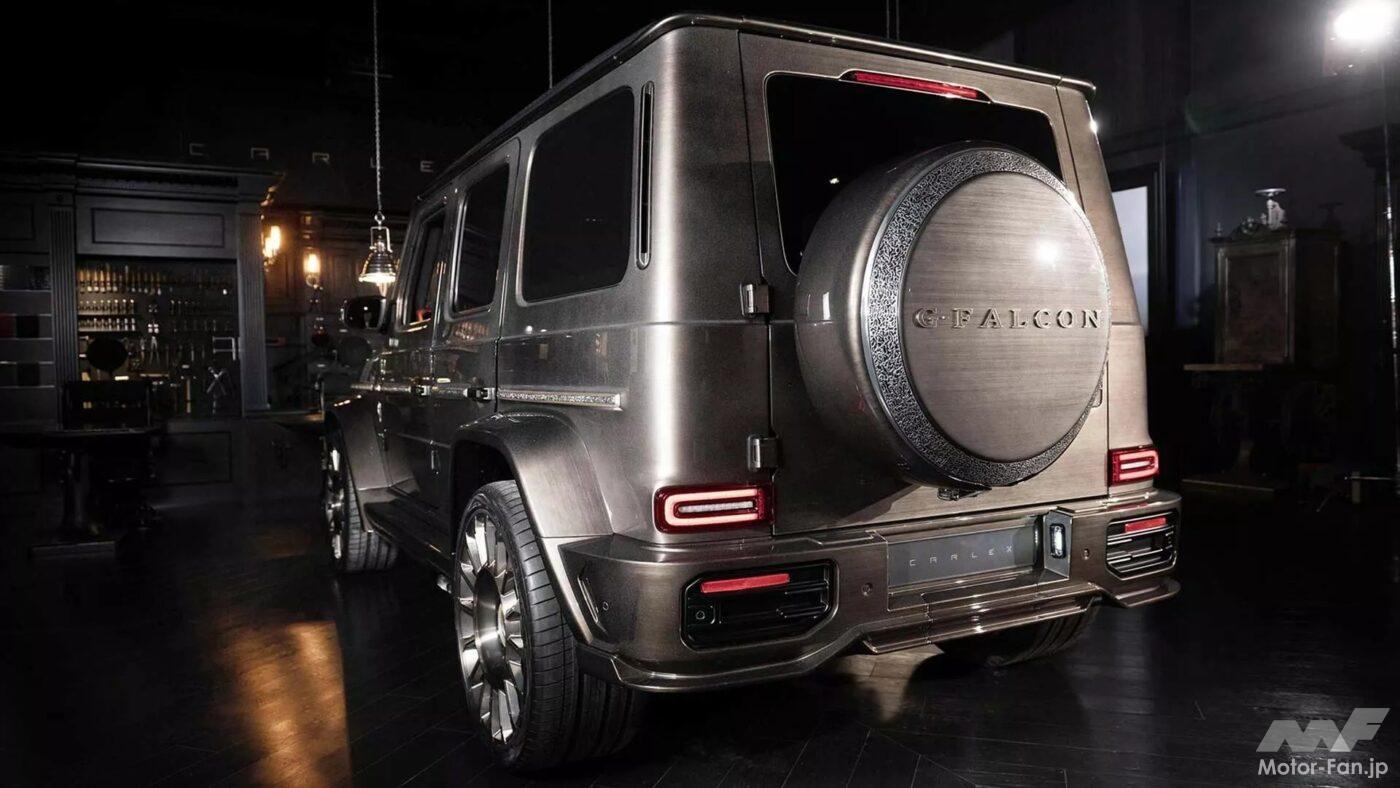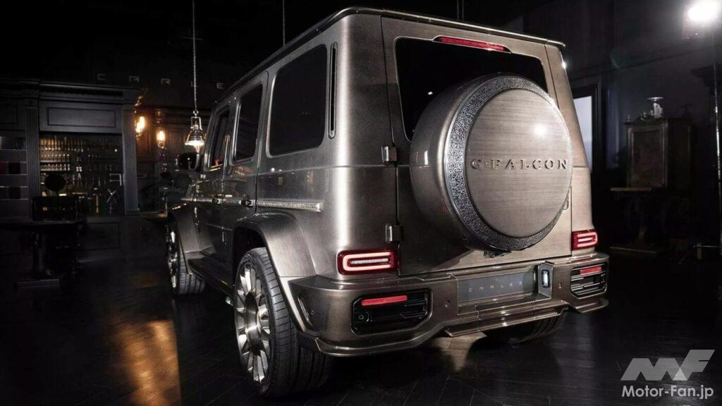 ふたつの企業とはCarlex DesignとVO Falconだ。カーレックスは、4年の製作期間を費やし、想像しうる最高の G クラスを作り上げたという。ルーフ全体に広がる手描きの彫刻も素晴らしいが、ダイヤモンドが散りばめられた、特別なメタリックブロンズシェードのボディも重厚で存在感がある。さらに改良されたフロントエンド、張り出したホイールアーチ、新設計されたロッカーパネル、特徴的なバンパーも見ることができる。また、カラーマッチしたホイールが4×4の神秘性を高め、さらに「G-Falcon」と書かれたスペアホイーカバーも高級感が溢れている。