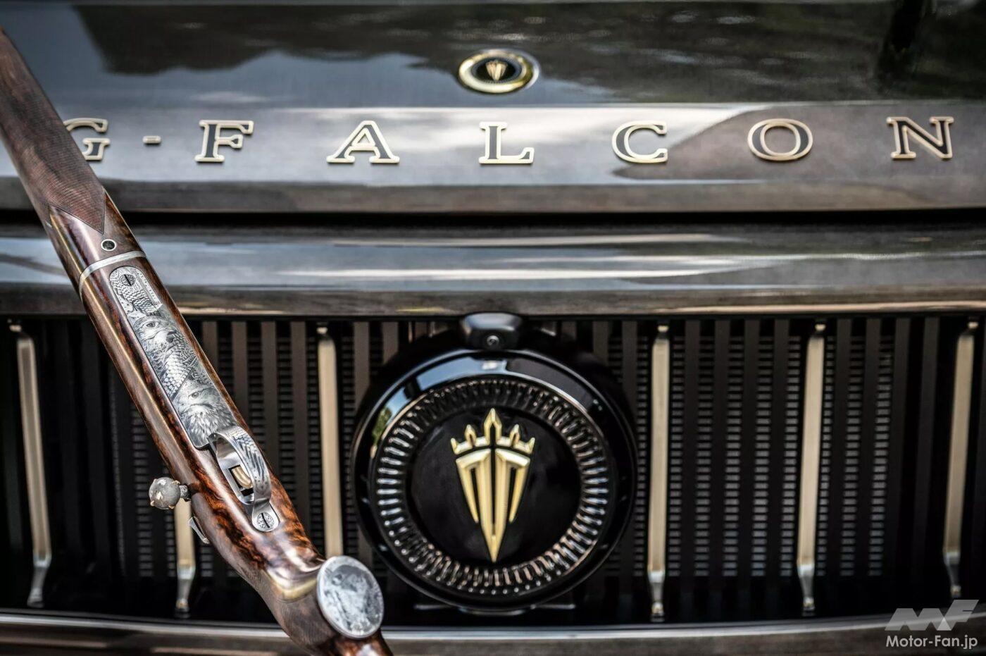 エクステリアの最大の見どころは、その名称どおり、ファルコン→ハヤブサの壁画がルーフ全体に広まっているところだ。鷹狩りは世界中で行なわれており、特に中東では長い間人気がある。今回はふたつの企業が協力して、アラビアの鷹狩りの世界を称えるために、重厚なメルセデス・ベンツ「Gクラス」と、特注の狩猟用ライフルが製作された。