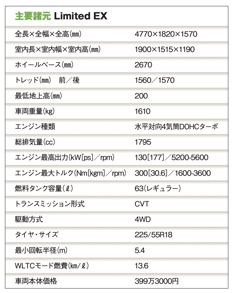 最新のD型レヴォーグをクロスオーバー化し、国内専用車としたのがレイバック。レヴォーグとは違い、1.8ℓ DOHC直噴ターボ〝DIT〞+リニアトロニック+AWD、アイサイトXを標準装備する「リミテッドEX」の1グレードのみの展開。専用エクステリアが与えられ、足まわりはスバル最上と言っていい乗り心地を実現したクロストレックのものを採用する(ファルケンのオールシーズンタイヤを含む)。