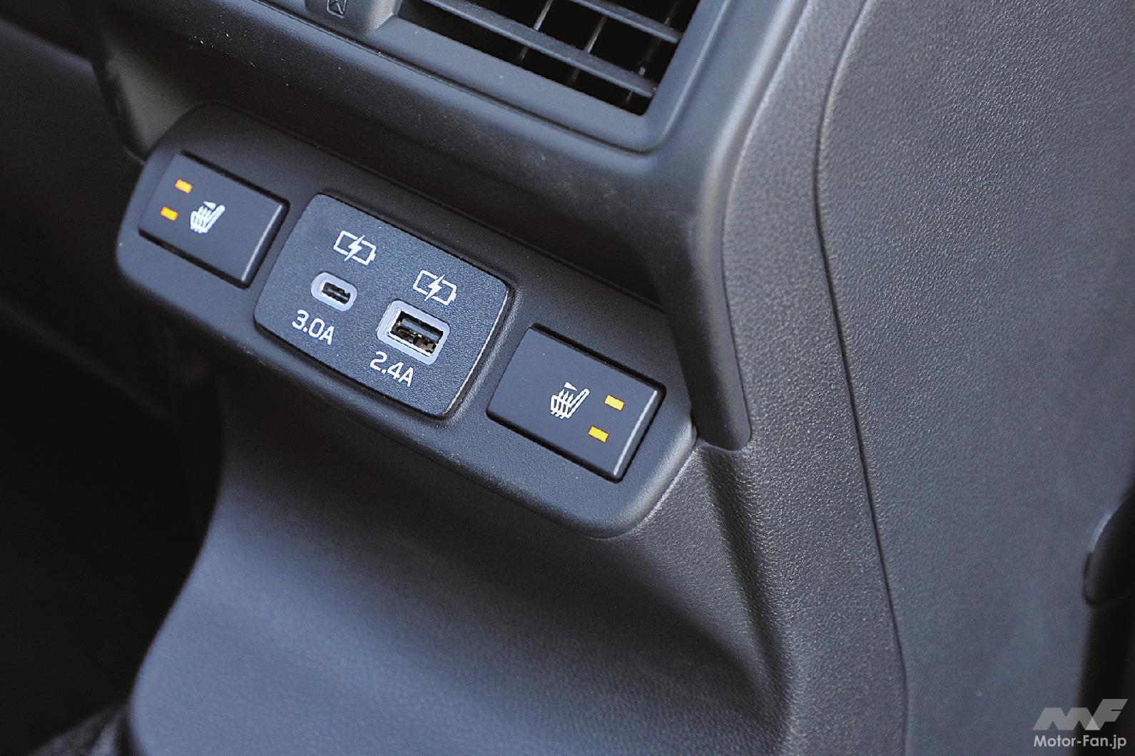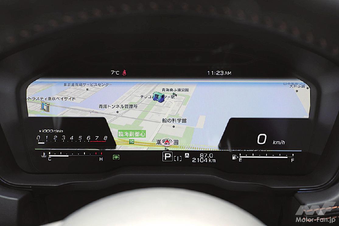 しかしD型レヴォーグ同様、進化したデジタルマルチビューモニター、ハーマンカードンサウンドシステム、リモートエアコン機能を追加したSUBARU STARLINK、Apple CarPlay、地図アプリ情報の表示機能を備えた12.3インチのフル液晶メーター、表示画面を拡張したAndroidAuto対応の11.6インチのセンターインフォメーションディスプレイなどを採用。ちなみに前席シートサイドのサポート部分はレヴォーグより低めに設定。それは着座位置が高まったことへの配慮である。