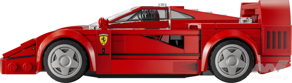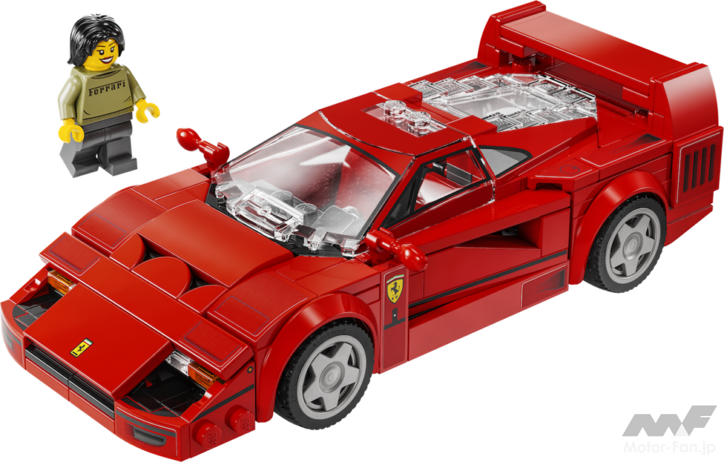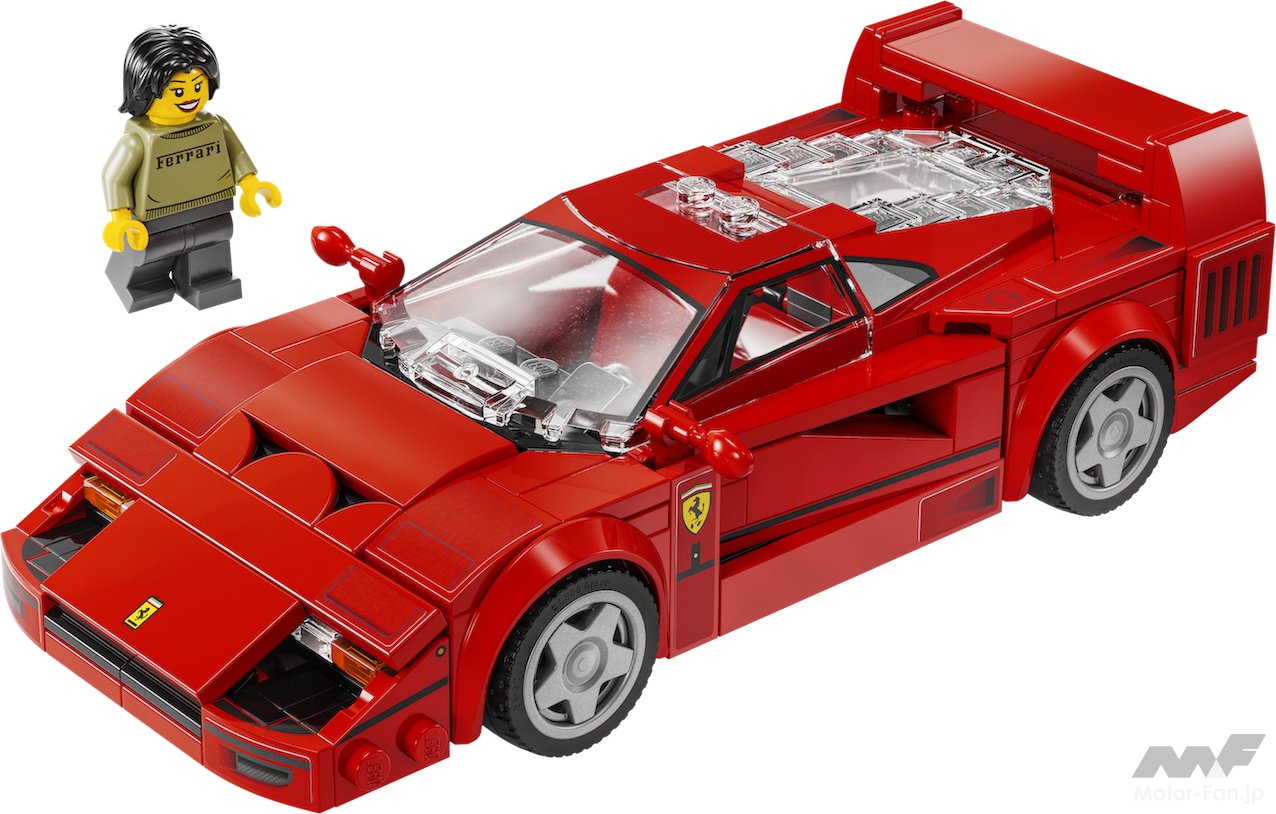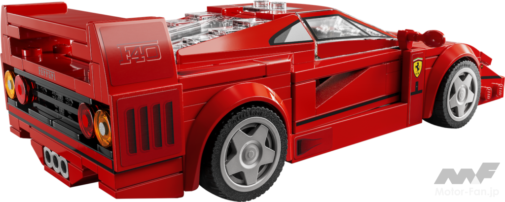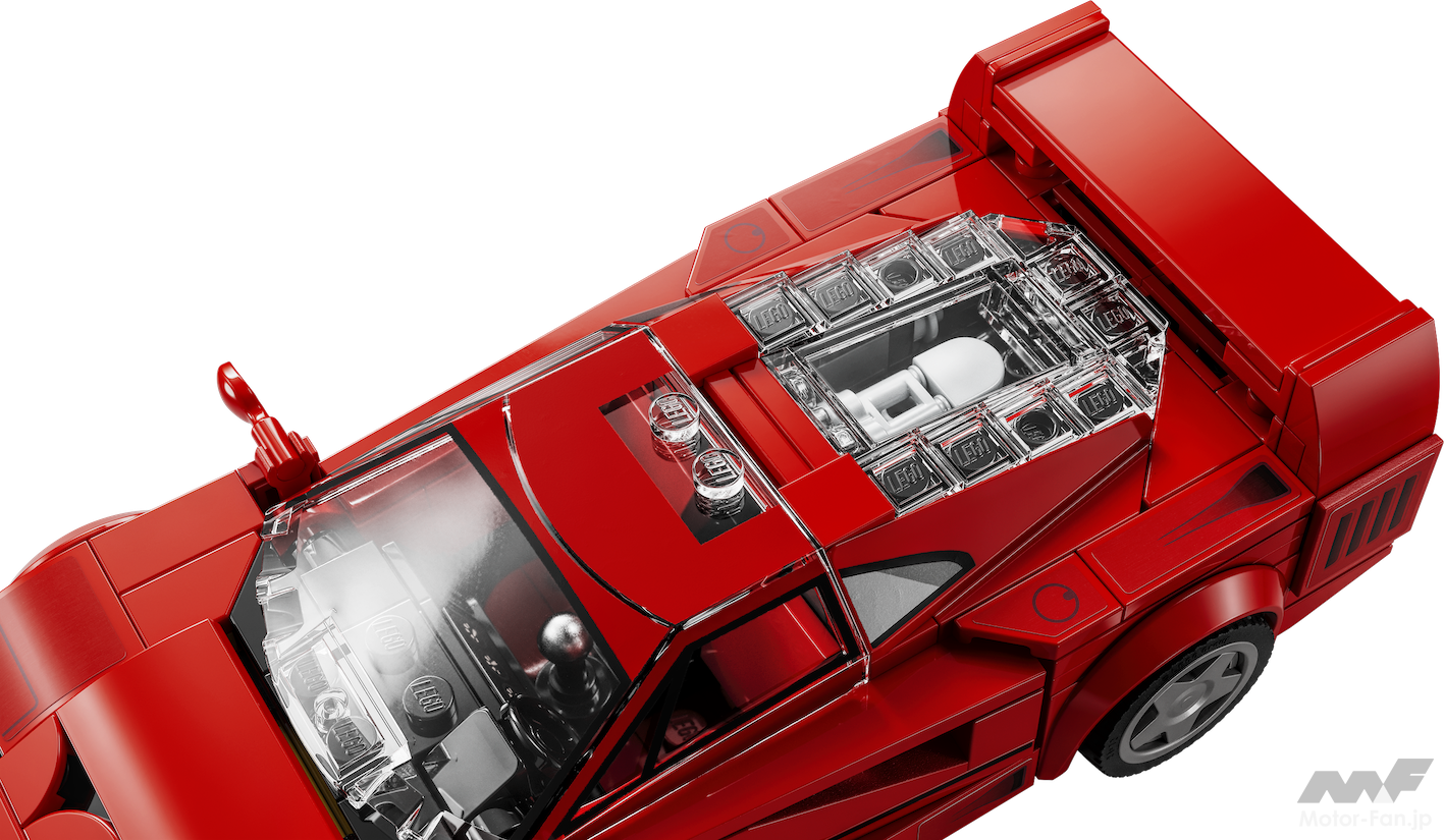 まずフェラーリF40。これは1987年にフェラーリが創業40年を記念して発売したスーパーカーで、今でも伝説の名車としてファンの間で語り継がれる歴史的名車であることはご存知の通り。V型8気筒ツインターボエンジンは478PSで、当時は世界最速といわれたこのクルマをレゴ®は見事に再現。流麗なボディデザインやインテリアまで、ブロックとは思えないほどF40の雰囲気を伝えてくれる。