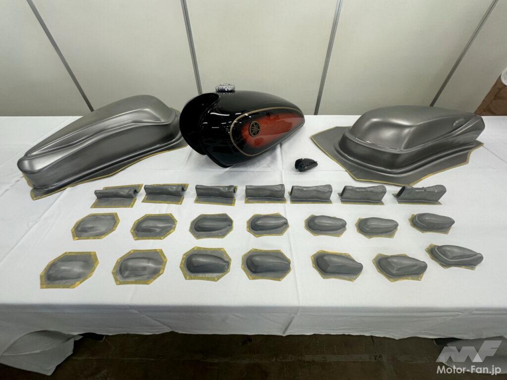 バイクの燃料タンクはどうやって作るのか。ヤカンのように液体が漏れないような密閉空間を金属で製作しているわけだが、ここでは、本物と同じように作られたミニチュアタンクの製造過程の変遷を見ることで出来上がるまでがイメージできる。ざっくりと説明すれば、左右とセンター下側の3つのパーツをプレスで叩き出しながら成形し、最終的には溶接で組み上げるわけだが、何度も何度もプレス工程を経て、あの丸いタンクの形になっていくのがわかる。