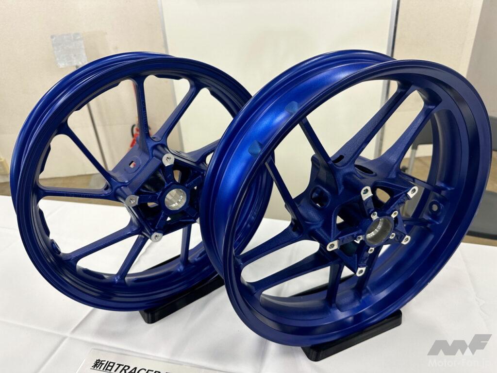 それほど変化しているように見えなかったアルミ鋳造ホイール(ヤマハは、4輪も含めおそらく世界で唯一社内でホイールを作る車体メーカー)。実はスポーク、リム、ハブなどを各部で軽量化されているだけでなく、デザイン面でも進化している。