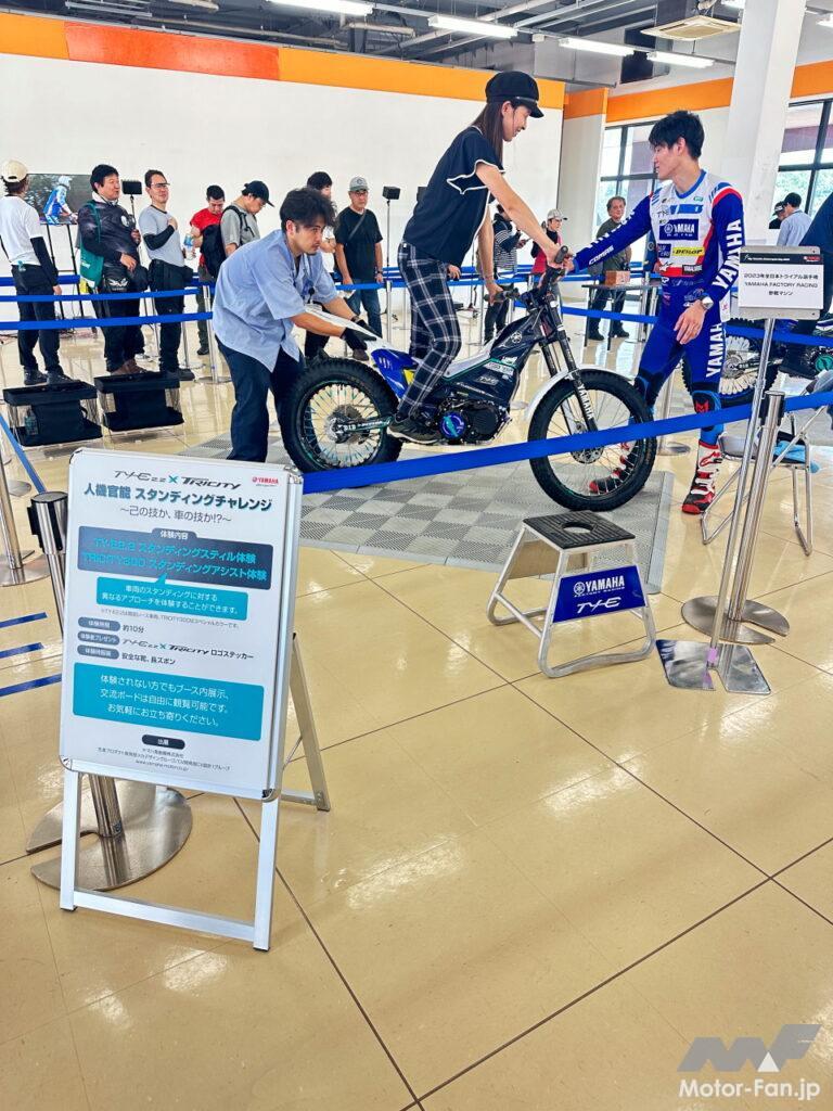 電動トライアルバイク「TY-E2.2」を使った黒山健一さん、氏川政哉さんによるトライアルデモ。これがライダー本人たちがインカムでトークを交えながら曲芸を披露してくれて、すごく楽しめるもの。現在、ヤマハからトライアルタイプの市販車は販売していないが、2輪メーカーとしてその文化を下支えする姿勢に頭が下がる思いだ。
