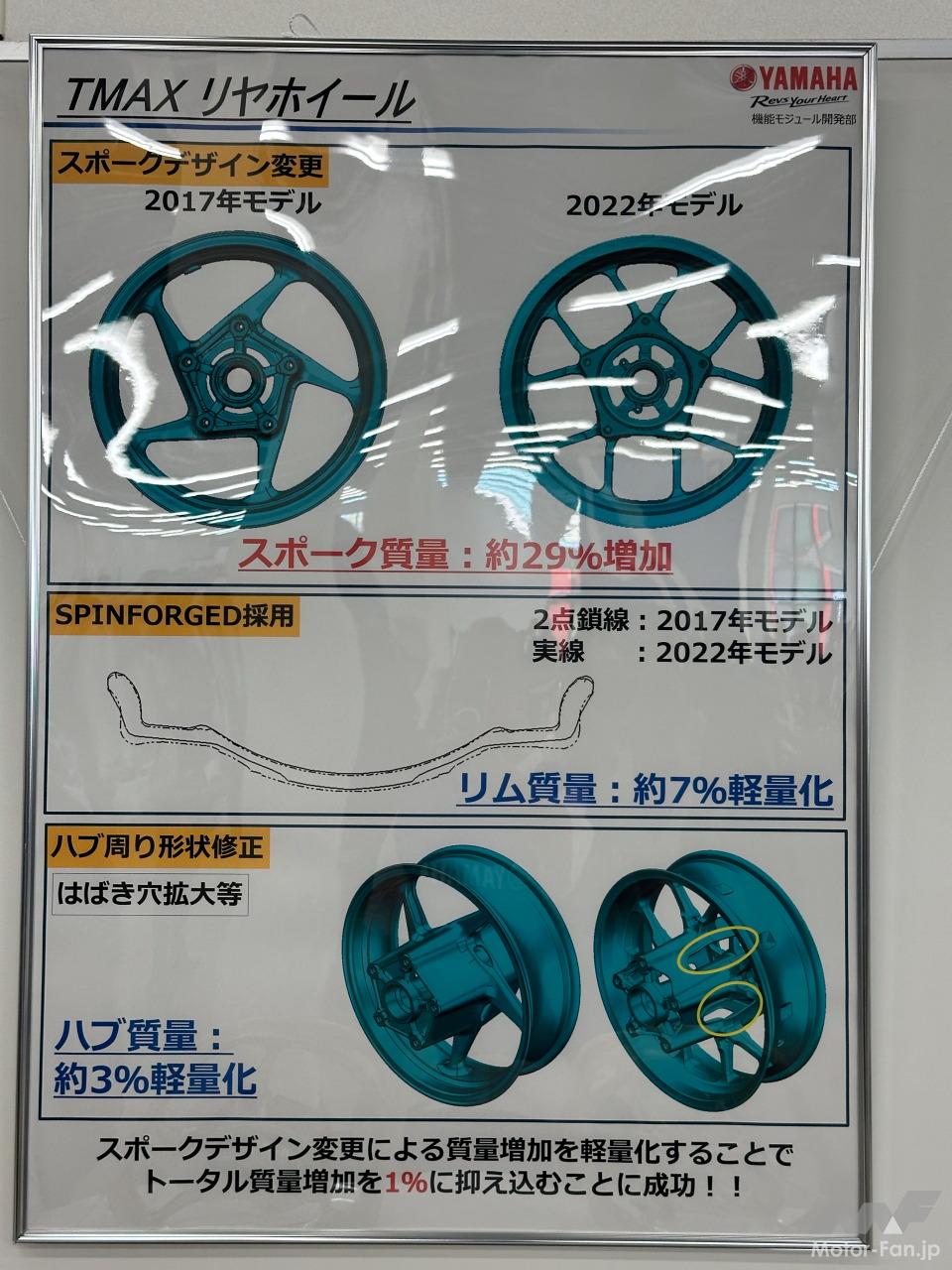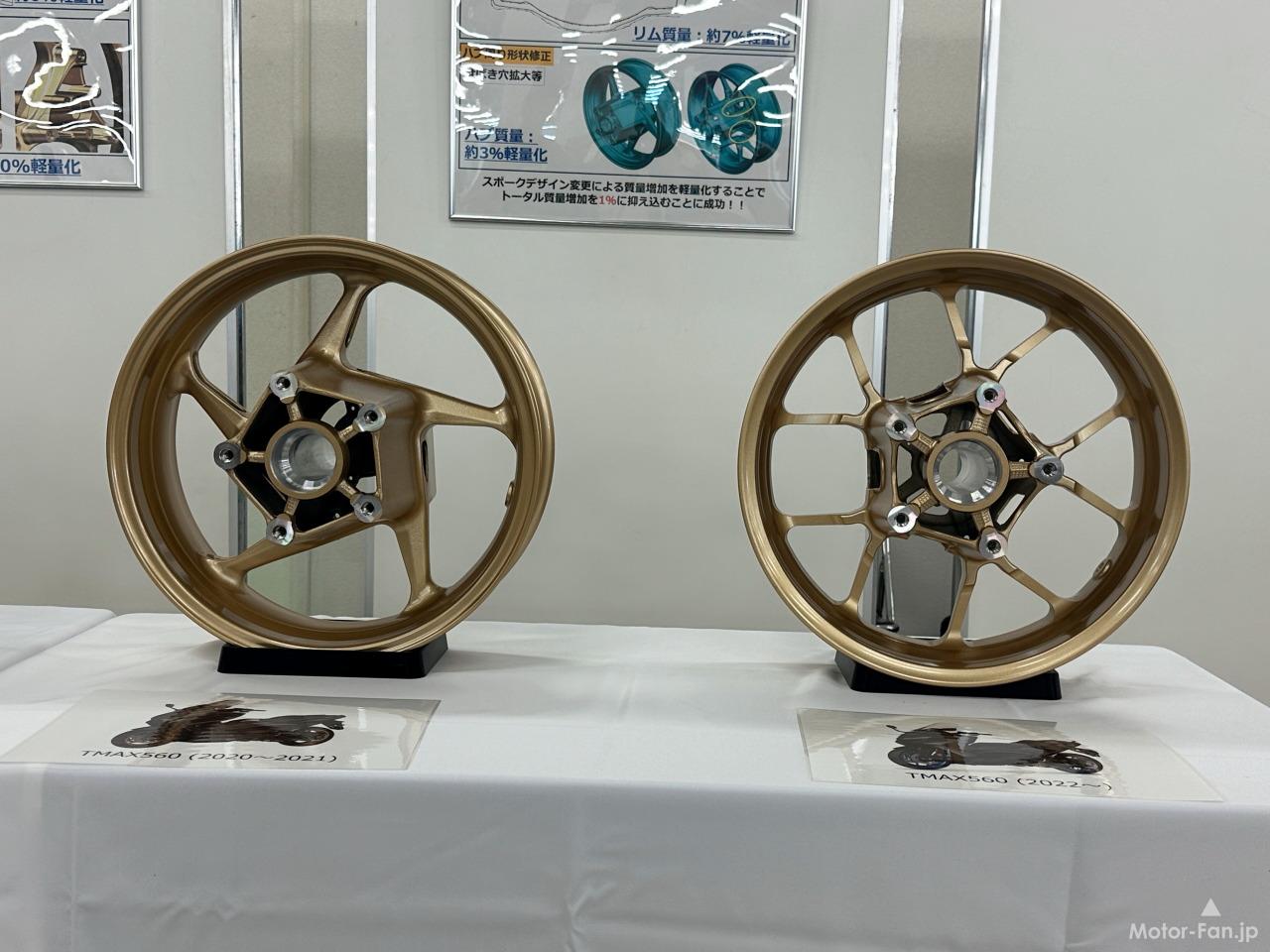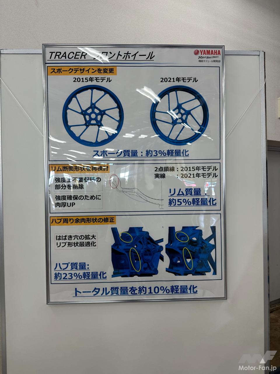 それほど変化しているように見えなかったアルミ鋳造ホイール(ヤマハは、4輪も含めおそらく世界で唯一社内でホイールを作る車体メーカー)。実はスポーク、リム、ハブなどを各部で軽量化されているだけでなく、デザイン面でも進化している。