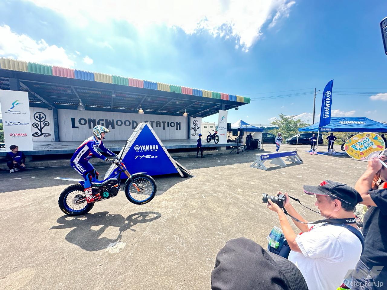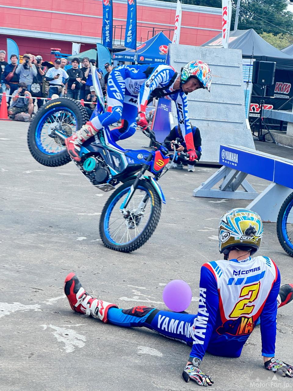 電動トライアルバイク「TY-E2.2」を使った黒山健一さん、氏川政哉さんによるトライアルデモ。これがライダー本人たちがインカムでトークを交えながら曲芸を披露してくれて、すごく楽しめるもの。現在、ヤマハからトライアルタイプの市販車は販売していないが、2輪メーカーとしてその文化を下支えする姿勢に頭が下がる思いだ。
