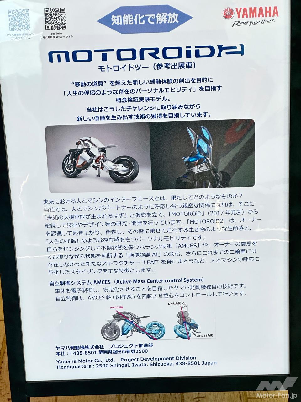 倒れないバイクということで、ジャパンモビリティショー2024に出展した自律できるバイク「MOTOROiD2」と「ELOVE」のデモンストレーション、電動トライアルバイク「TY-E2.2」と3輪バイク「TRICITY」を使用した人力と機械によるスタンディングの体験などもヤマハならではの見どころ。