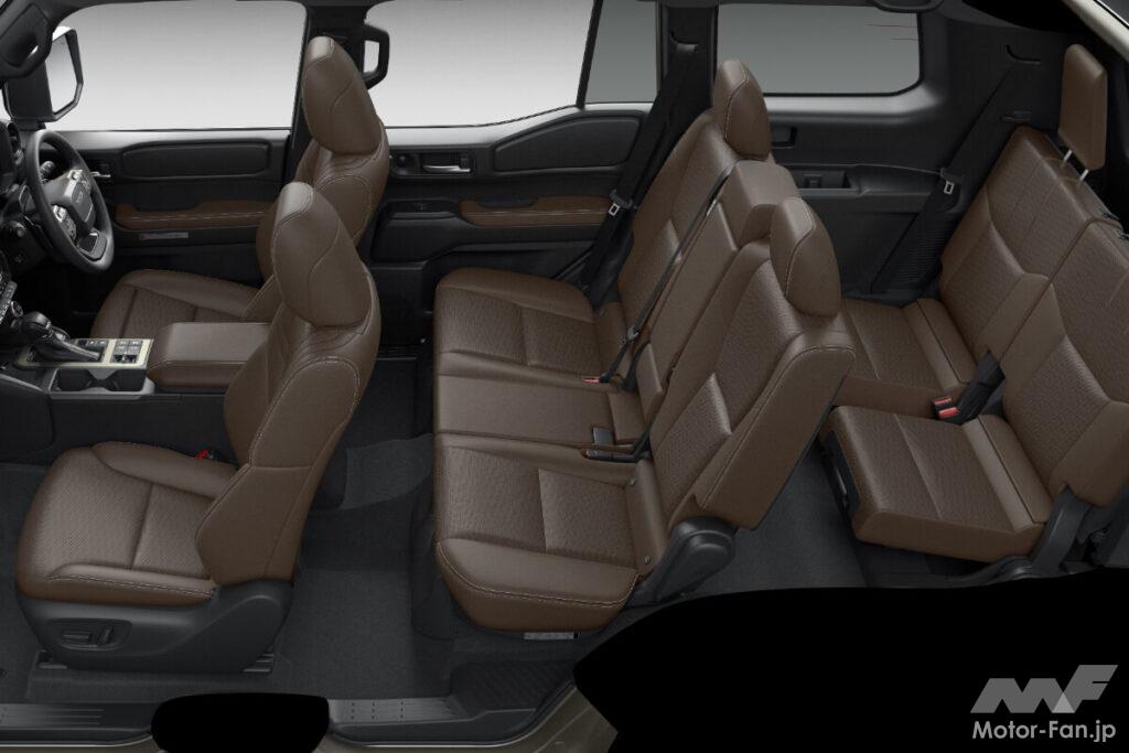 どちらも新ラダーフレームを用いたGA-Fプラットフォームが採用されており、ボディサイズはランクル300のほうが60mmほど長いだけでボディサイズはほぼ同じとなる。それによって室内空間や荷室空間にも大きな差はない。7人乗りは3列目シートがやや窮屈な点も同じだ。