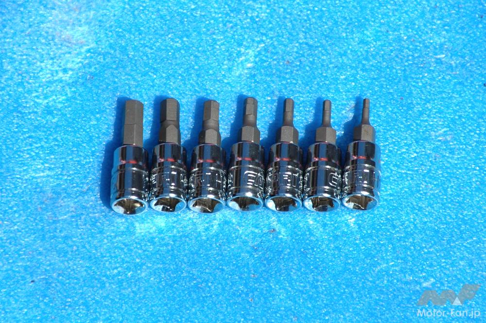 とは言え、無名のノンブランド品を買うことはやはりオススメできない。L字型レンチと同様にヘキサゴンソケットも精度と品質が何よりも大切な工具だからだ。安物のヘキサゴンソケットを使用すると、ボルトを舐めたり、先端のビットやソケット部分が破損してケガにつながることもある。購入に際してはケチることなく「上質工具」をやはり選ぶべきだろう。予算不足でフルセットを買う余裕がないのなら、妥協して安物を買うのではなく、一流メーカー品の中から必要なサイズを選んで単品買いすることをオススメしたい。
