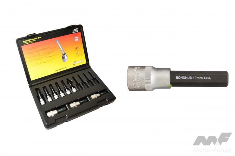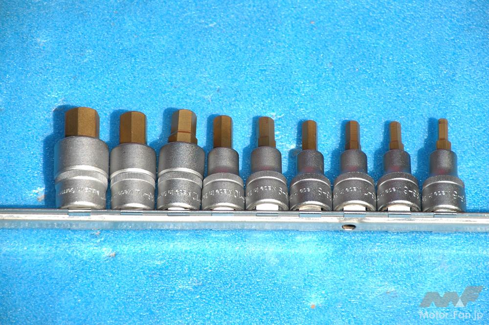 使用時の剛性感は以前使用していた他社のヘキサゴンソケットとは比べものにならず、作業中にボルトの状態を把握しやすい。力をダイレクトにボルトに伝えられるので強めにアプローチしてもボルトにダメージを与えることなく、パキッという快音とともに緩むのだ。しかも、よほど状態が酷くなければ舐めかけのボルトを緩めるのにも使えてしまう。筆者が所有する5~17mmまでの9本入り・差込角1/2のショートヘキサゴンソケットセット(986/9N)が実売価格で1万5000~2万円程度。3~10mmまでの8本入り・差込角3/8のセット(8801/8H)が2万~3万円程度と価格は決して安くはないが、誰にでも自信を持って進められるヘキサゴンソケットだ。