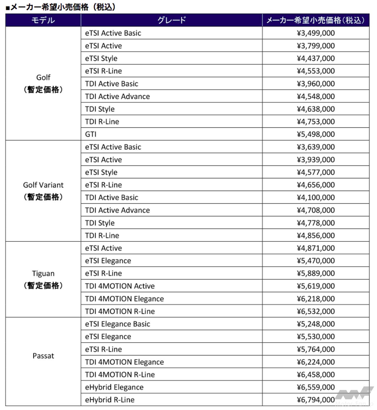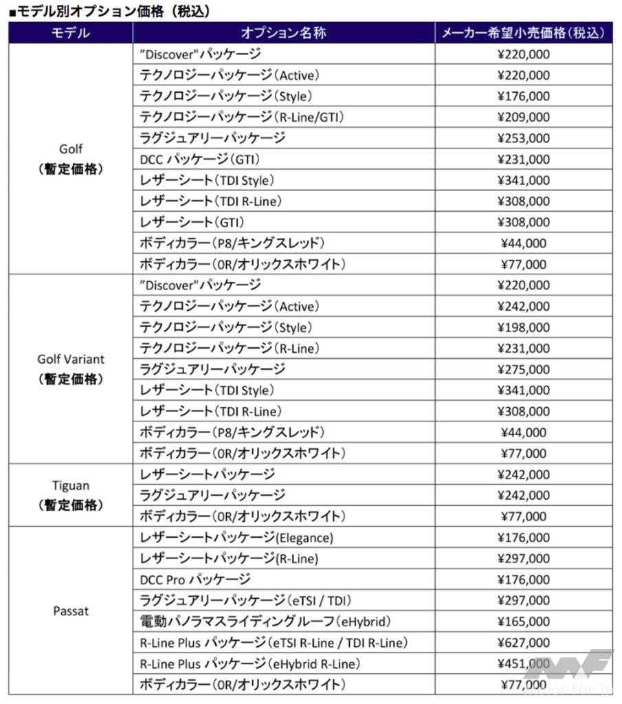 ゴルフ(ハッチバック)とゴルフ ヴァリント(ステーションワゴン)は内外装をブラッシュアップし、日本初採用のイルミネーション付きVWエンブレムが精悍なフロントデザインをより一層際立たせている。インフォテイメントシステムは最新の MIB4へと進化し、12.9インチ大型タッチディスプレイによる視認性と、演算処理の向上による地図スクロールなどのレスポンスが大幅に向上している。