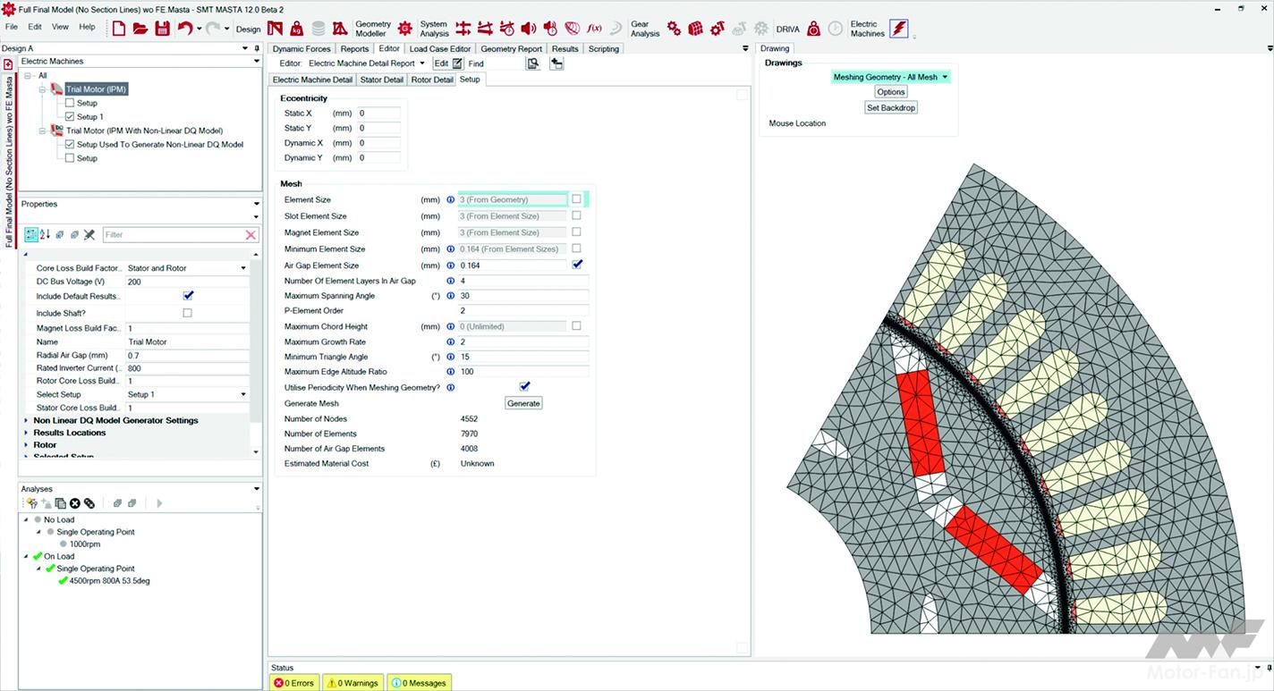 これまでのMASTAではギヤにかかる物理的な力を解くことで、ギヤやシャフトの変形や、それにともなう伝達の効率、振動などの振る舞いを解析してきたのだが、最新バージョンの12ではここに電磁界解析の機能が新たに加わっている。モーターのCADデータが作成できるようになり、力学的な解析ができるだけでなく、それを電磁気という要素と連成させた解析が可能になったのである。当然ながらモデルにはこの電磁界解析を前提としたメッシュも含まれる。