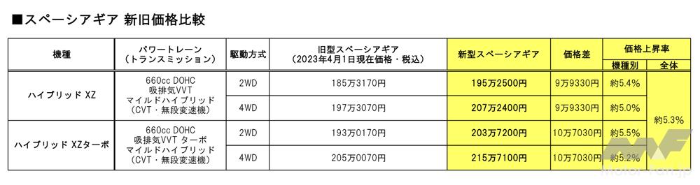 自然吸気車は2WD、4WDともに9万9330円の値上げ、ターボ車では2WD、4WD、こちらも仲良く10万7030円上がっており、総じて約5.3%の値上げ幅だ。