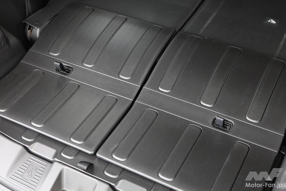 シートや荷室はアウトドアユースを意識したスペーシアギア専用の造りになっているが、こちらは旧型スペーシアギアでも備えていた。すなわち、シートのファブリック地は撥水加工済みになっているし、荷室はブラスチック仕立ての「防汚タイプラゲッジフロア」になっていて、泥や水で汚れた上着、靴を躊躇せずに放り込めるのがいい。何もアウトドアユースといわず、幼い子を持つ家庭に向け、スペーシアにだってオプションで用意すれば喜ばれそうだ。