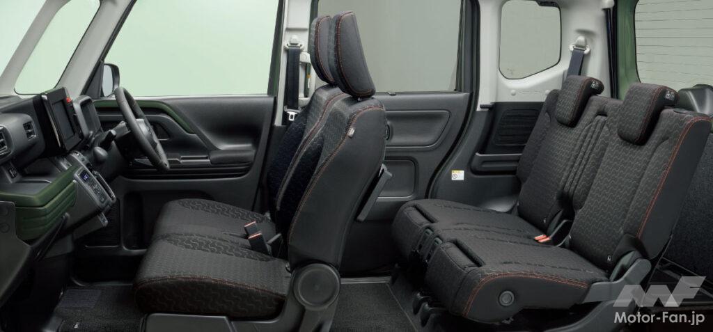 スペーシア ギアもデリカミニも、シート表皮に撥水加工を施したファブリックを採用。スペーシア ギアは防汚タイプラゲッジフロアが装備され、砂や汚れを気にすることなく使えるクルマとなっている。デリカミニは最上位グレードのG PremiumのみPVCシートバックとなり、シートバックも撥水仕様となるほか、T PremiumおよびG Premiumのみ樹脂ラゲッジボードとPVC後席シートバックが装備され、ラゲッジフロアがスペーシア ギアと同等となる。