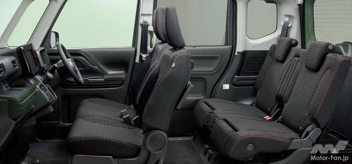 スペーシア ギアもデリカミニも、シート表皮に撥水加工を施したファブリックを採用。スペーシア ギアは防汚タイプラゲッジフロアが装備され、砂や汚れを気にすることなく使えるクルマとなっている。デリカミニは最上位グレードのG PremiumのみPVCシートバックとなり、シートバックも撥水仕様となるほか、T PremiumおよびG Premiumのみ樹脂ラゲッジボードとPVC後席シートバックが装備され、ラゲッジフロアがスペーシア ギアと同等となる。