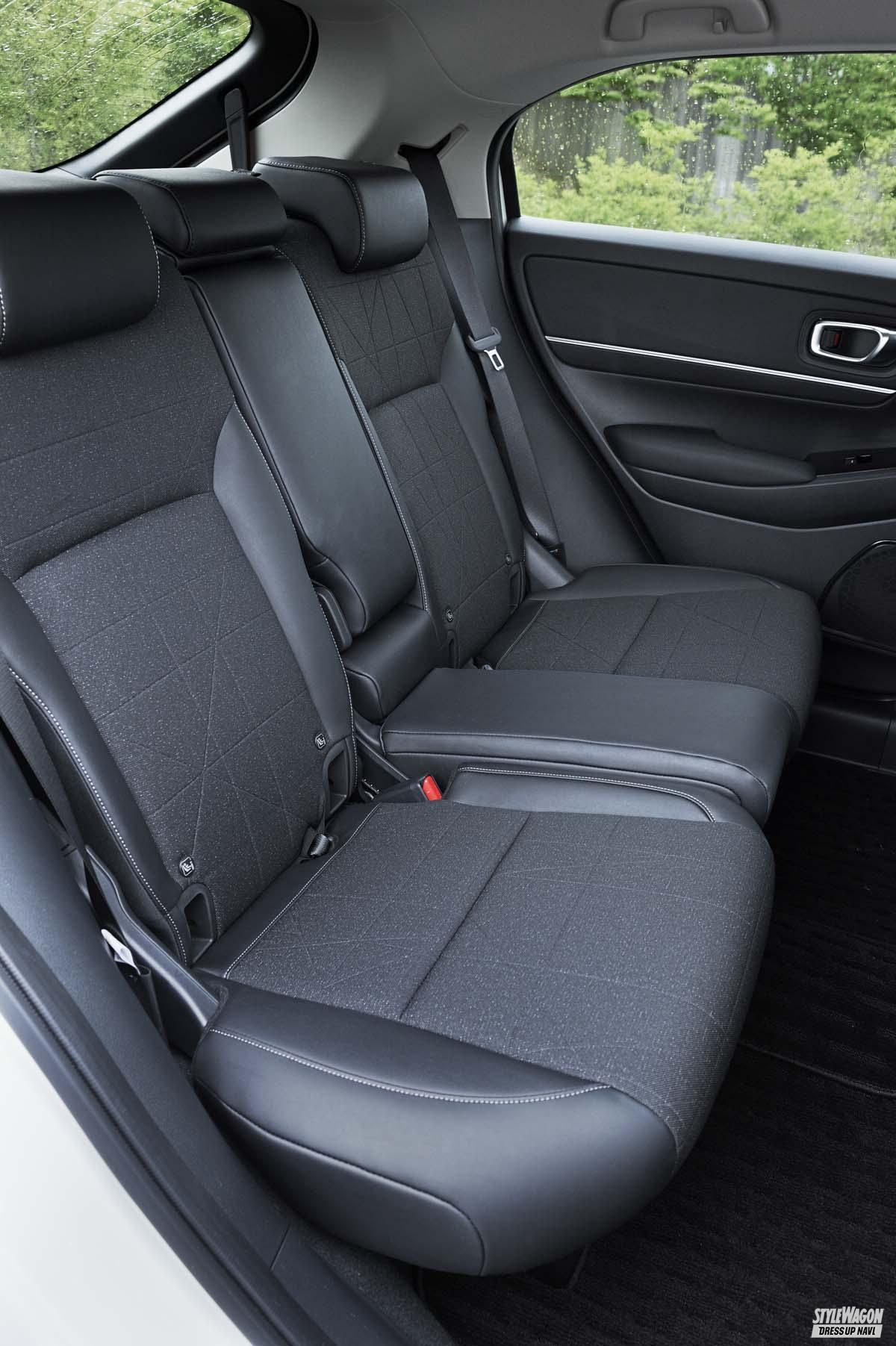 「e:HEV Z」はプライムスムースとナチュラルな質感のファブリックによるコンビシートを採用。後席の足元は従来型より35mm 拡大されている。