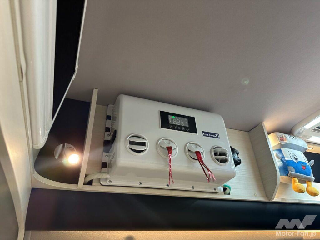バンコンなどサイズが小さいモデルに採用される傾向にあるのが、12Vで稼動するクーラーだ。その名の通り冷房するだけのものだが、室外機がいらず、配管が容易というメリットがある。本体が小型で居住空間にデットスペースができないのも利点だが、消費電力はそこまで小さいと言えず、100Ahくらいでは4時間も動けばいいほうだ(もちろん外気温や設定温度によって異なるが)。