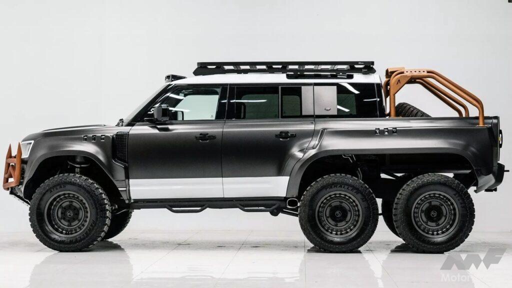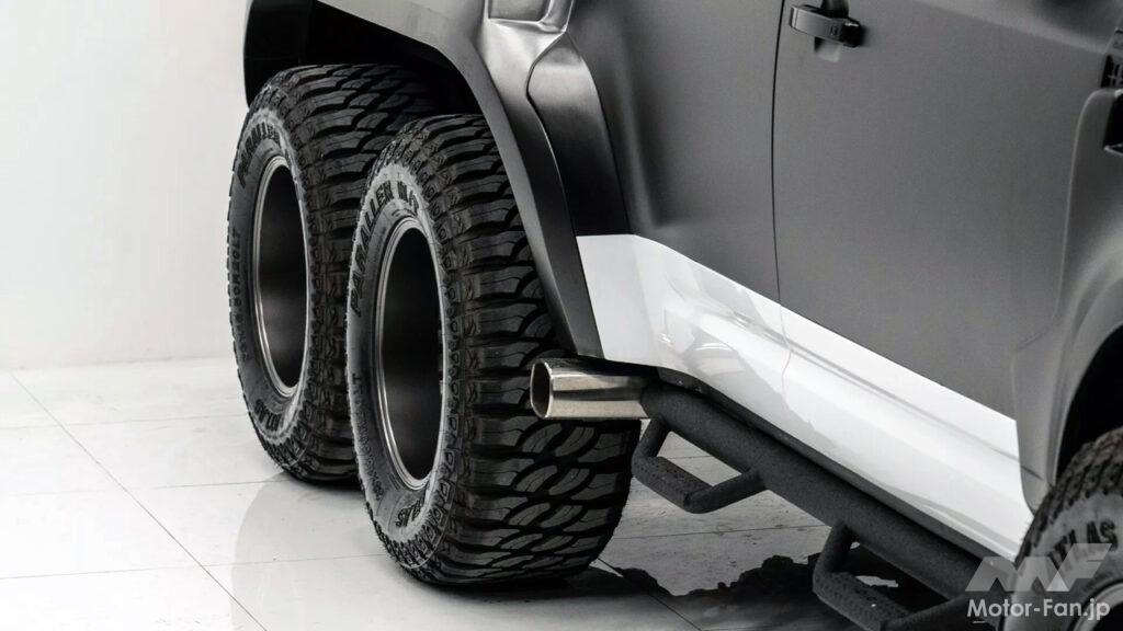 想像できる限り最もクレイジーな6×6ディフェンダーを作ろうと取り組んだ同ブランドは、シャーシを延長し、3つ目の車軸と2つのホイールを追加した。注目は、他の安価な6×6改造車とは異なり、2つの追加ホイールは単に走行するためだけのものではなく、駆動されるということだ。つまり、これは本格的な6輪駆動車ということだ。