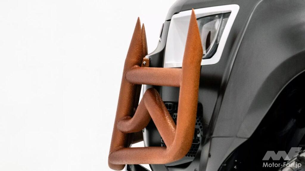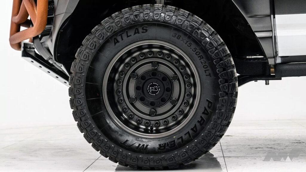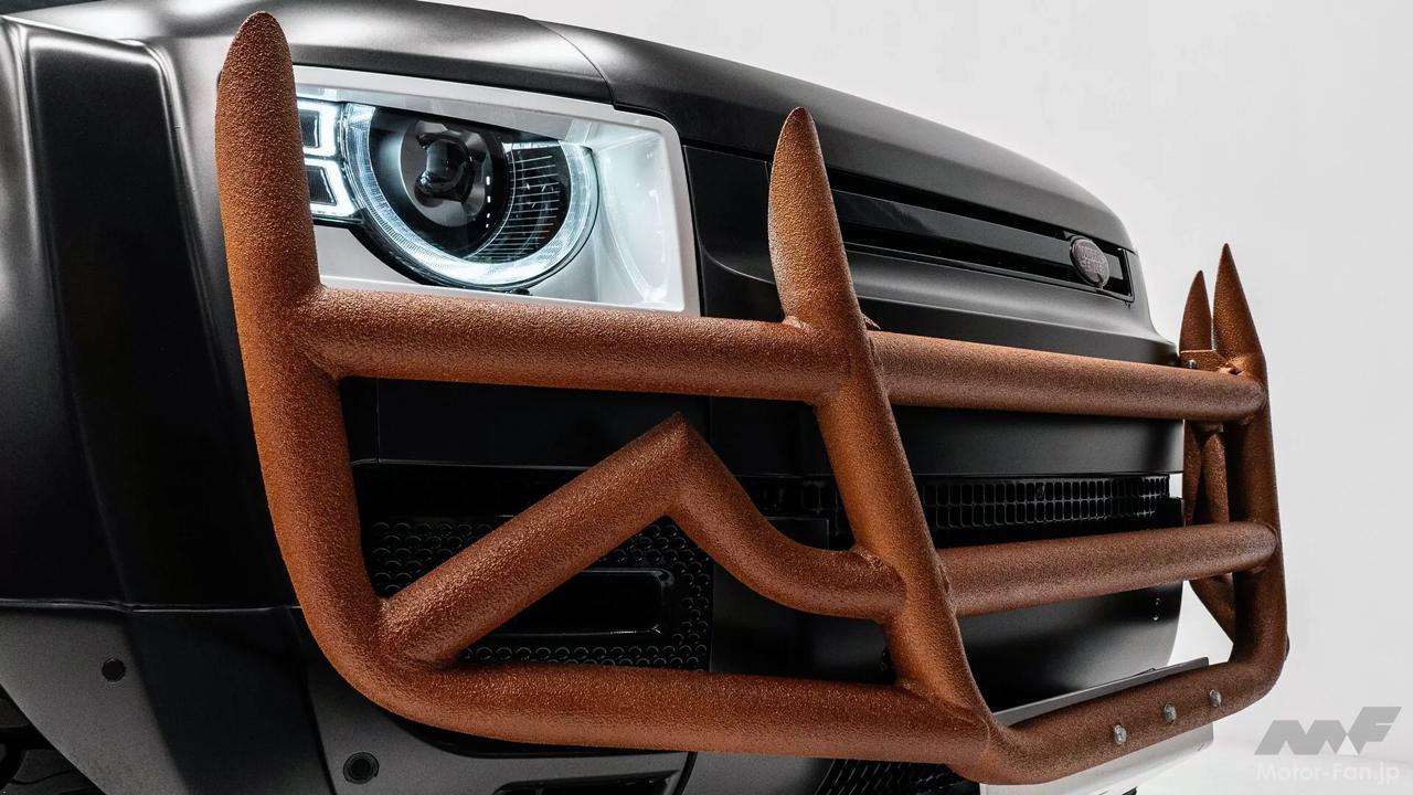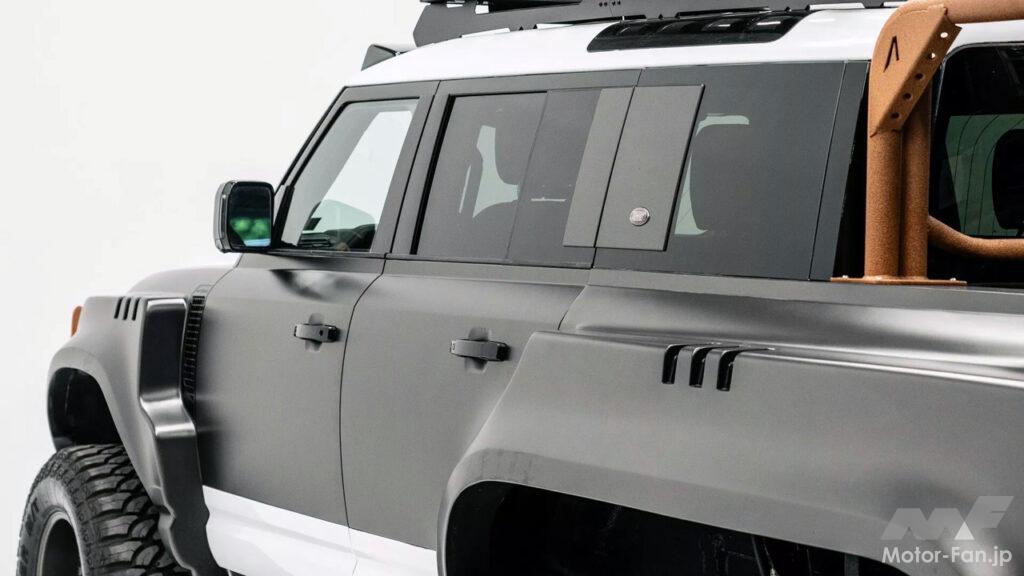 変更はホイールの追加にとどまらず、ディフェンダーのサスペンションセットアップを全面的に見直し、ボタン操作で車高を8インチ(20cm)上げ下げできるようにしたほか、20インチのミリタリースタイルのホイールに、巨大な38インチのタイヤを装着、想像できる限り最も困難なオフロードトレイルも楽々と走破可能にする。
