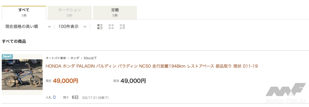 パルフレイの中古車を探してみたところ、グーバイクでは見つからずヤフオク!で2台見つかっただけだ。しかも7万円や15万円とロードパルより強気なスタート価格になっている。レア車は高くても売れるということなのだろうか。パルフレイの新車時につけられた価格は7万5000円だった。