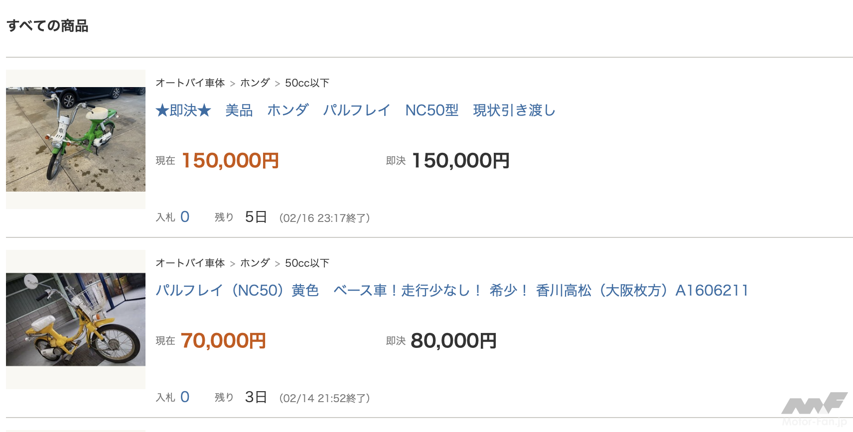 パルフレイの中古車を探してみたところ、グーバイクでは見つからずヤフオク!で2台見つかっただけだ。しかも7万円や15万円とロードパルより強気なスタート価格になっている。レア車は高くても売れるということなのだろうか。パルフレイの新車時につけられた価格は7万5000円だった。