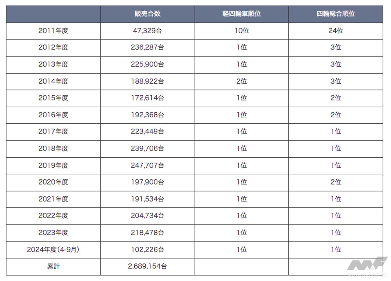 N-BOX シリーズ年度販売台数推移と最近の主な記録(自販連および全軽自協調べ)