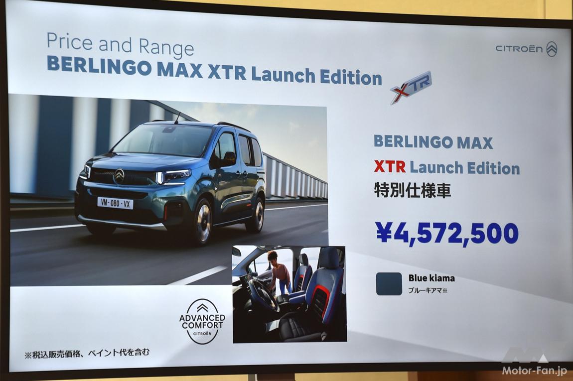 また、新型ベルランゴのデビューを記念した特別仕様車「XTR ローンチエディション」をベルランゴのみに設定。こちらは457万2500円で、フロントに「アドバンスドコンフォートシート」、17インチアロイホイール(205/55R17タイヤ)、前後スキッドプレート、専用カラーダッシュボード、専用エアバンプカラーアクセント、XTRバッジが装着される。