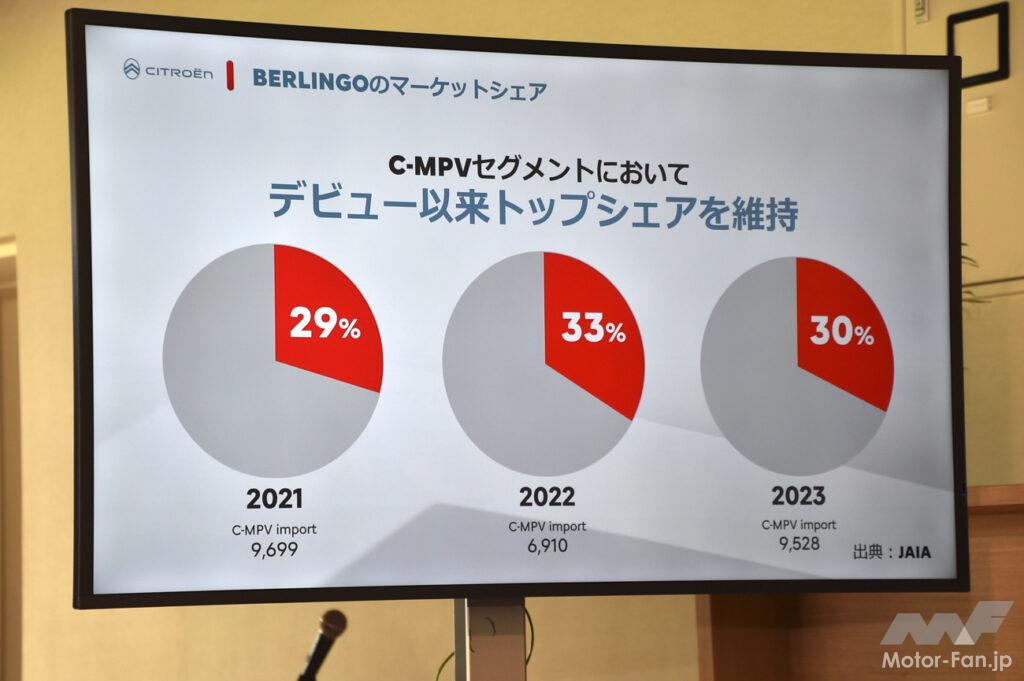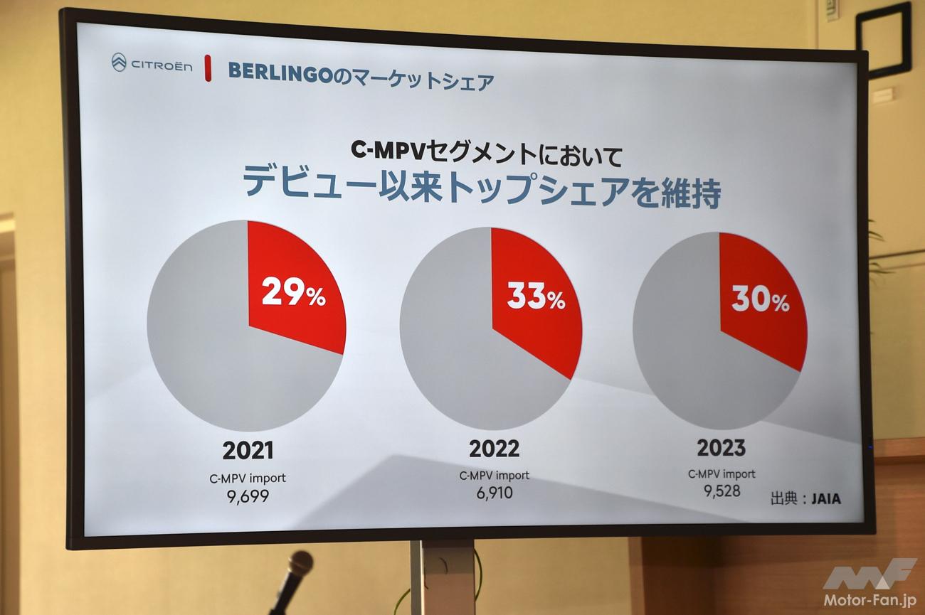 ベルランゴは日本で販売されるシトロエン車の約半数を占めるだけでなく、これまでルノー・カングーが不動の人気だった輸入MPV市場においても、デビュー以来トップシェアを獲得してきているという。