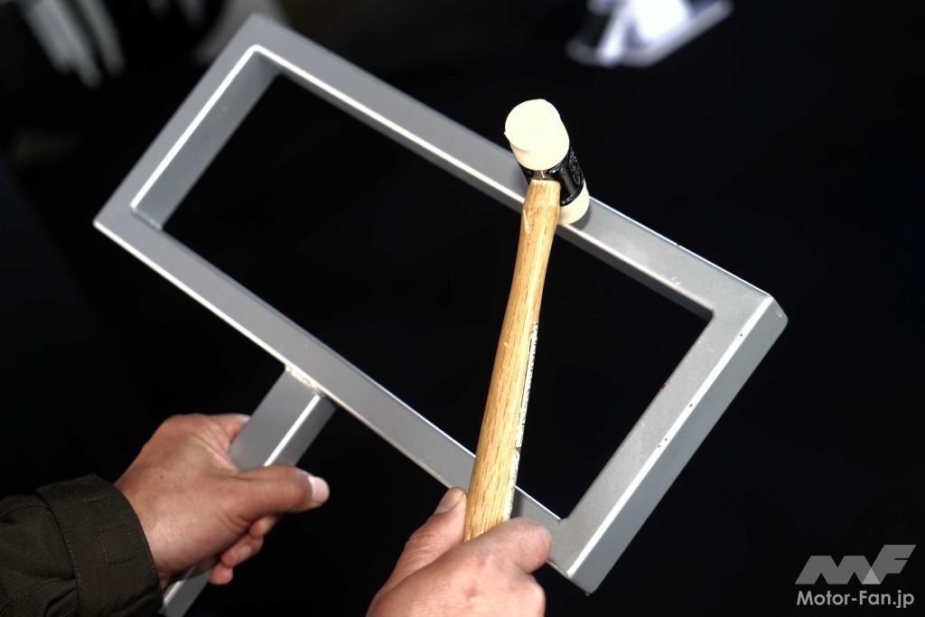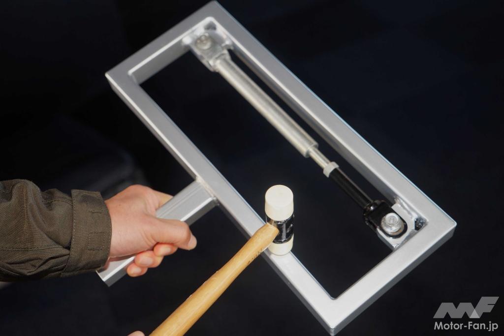 原理、効果を疑似体験するため、車体フレームに見立てたスチール製の枠をハンマーで叩く実験を行ってみた。何もない状態でフレームを叩くと音は大きく響き、振動が手に伝わる。硬いロッド(ダンパー無し)で枠内を繋いだ場合、全体の剛性は高まるが振動も音も軽減されるが消えるまでに時間がかかる。パフォーマンスダンパーを装着した枠では見事に振動は消え、音は響かずに鈍い音がするだけだった。