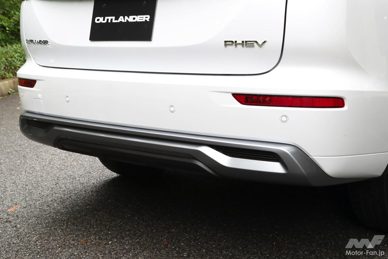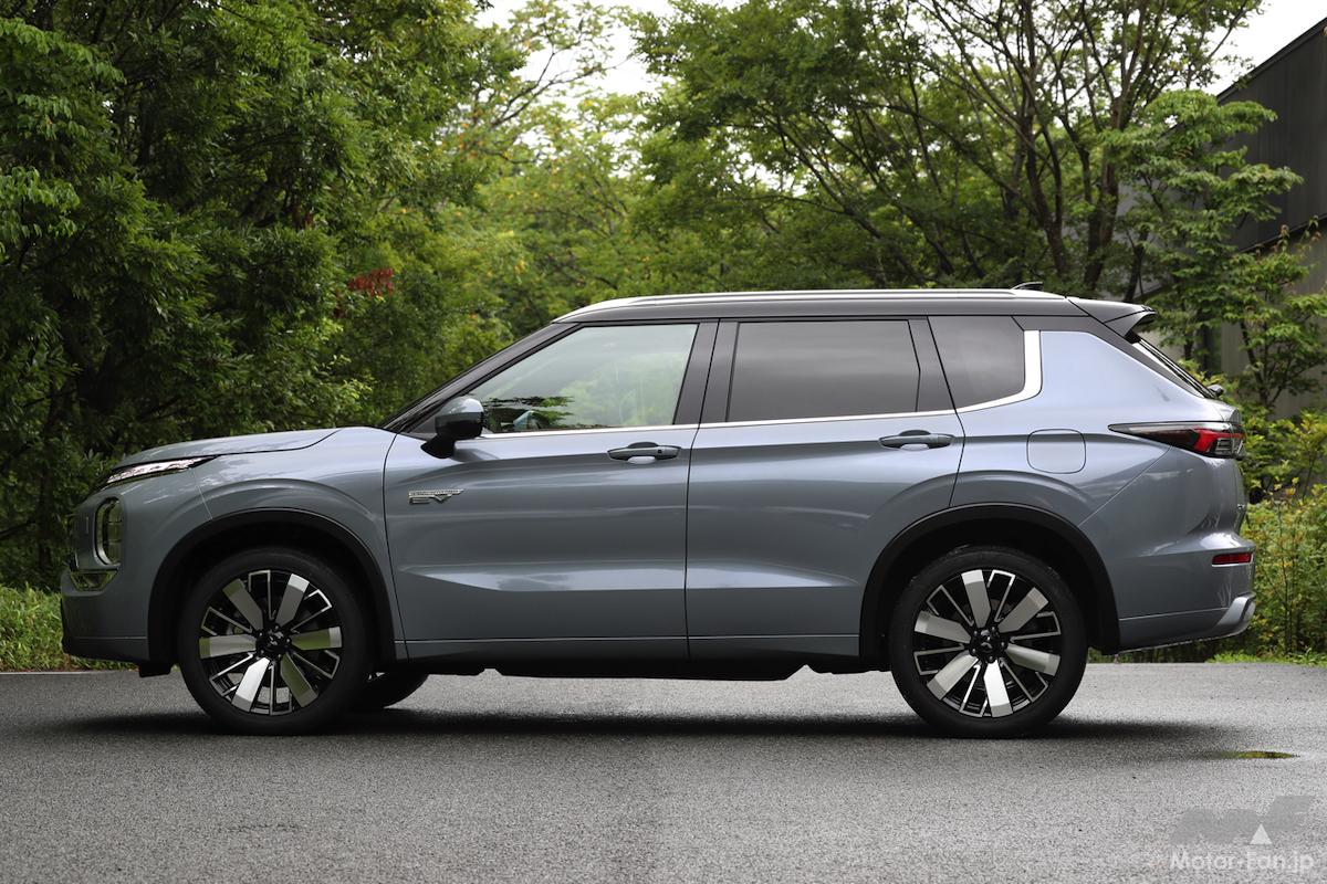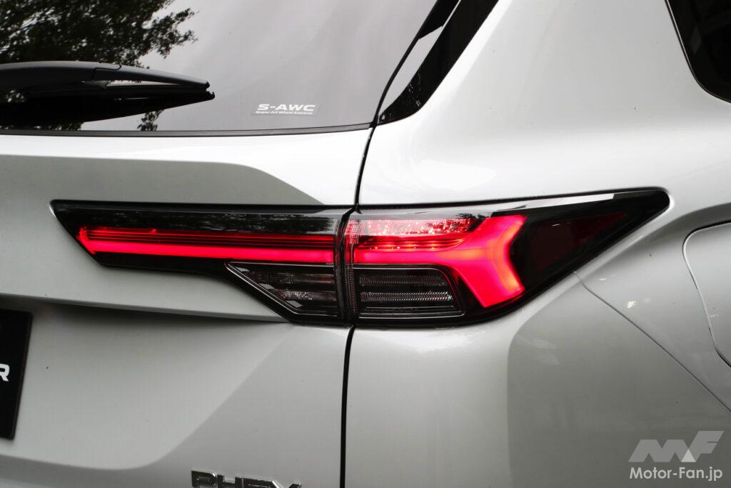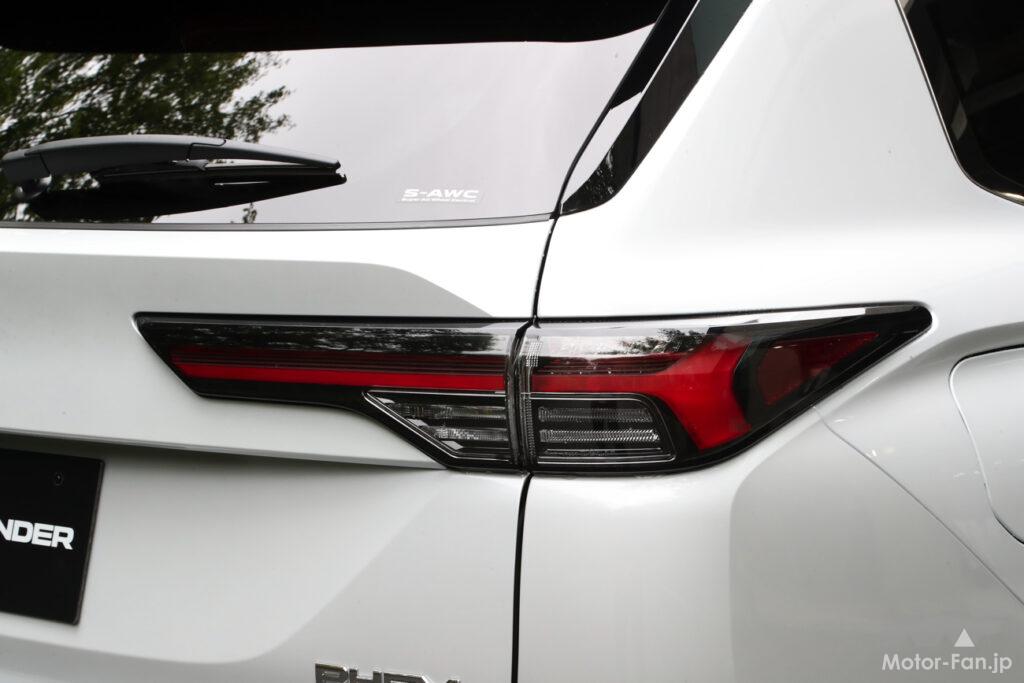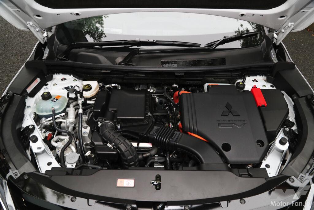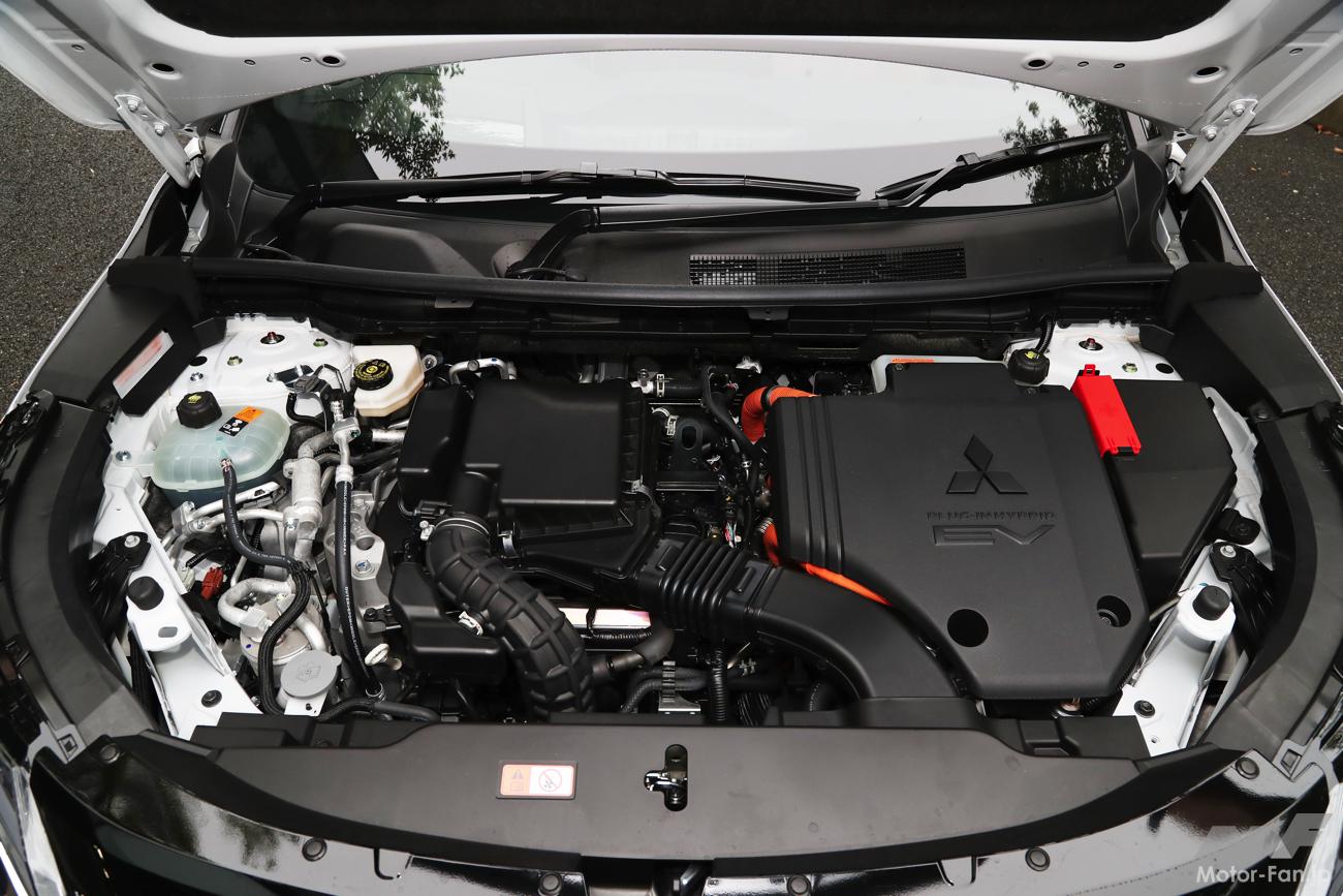 PHEVパワートレインはバッテリー容量を従来モデルの20.0kWhから22.7kWhに強化。これにより電池単体出力は60%増し、システム総合出力では約20%アップを達成。加速力も高まっているが、これはランサーがランサーエボリューションになるくらいの差があるという。もちろんEV航続距離も伸びており、従来の83km(87km)から102km(106km)と、100km台となりEV走行がより使いやすくなった。