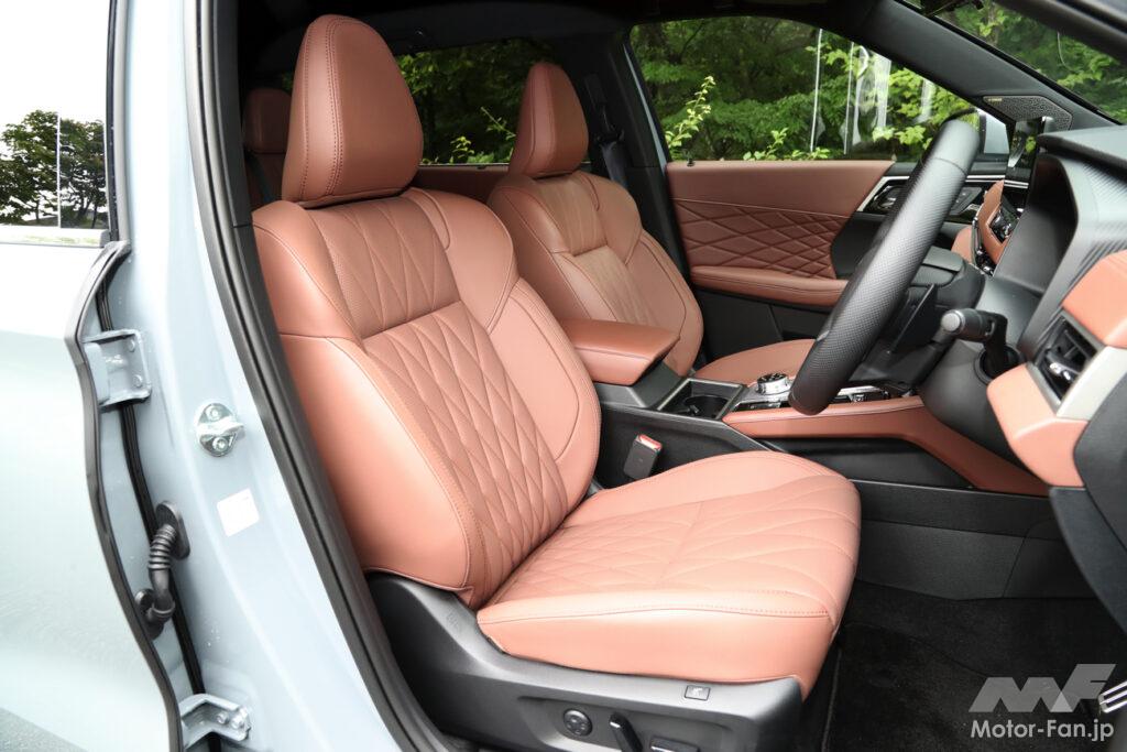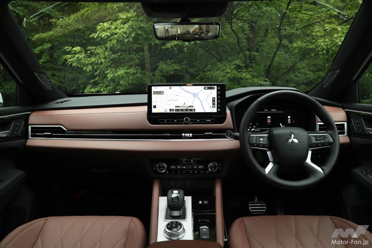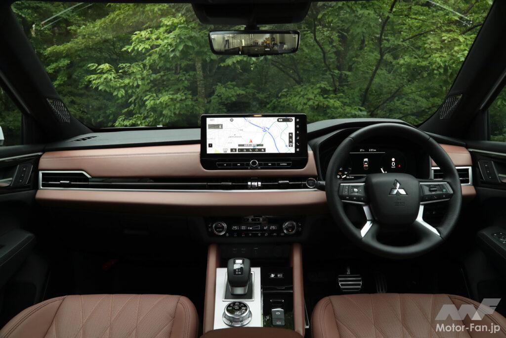 新型アウトランダーではコンセプトである力強さ、上質感、頼もしさ、滑らかな走りをこめた”威風堂々”をさらに洗練。より上質な乗り心地とより安心感のある操縦安定性を実現。快適性や機能性を高めたより上質なインテリアには、画面サイズを拡大したナビゲーションシステムにより先進感も高めている。さらに、PHEVシステムの強化により、EV航続距離を延伸しただけでなく、走りはより力強く滑らかになっているという。
