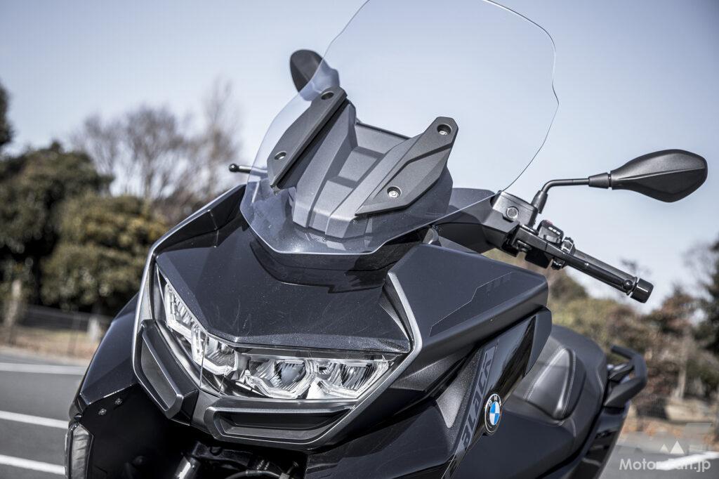初代C 650 Sportから受け継がれた個性的なフレックスケースを装備。停車時は底面を下げる事でメットインスペースが確保される。内側左脇の白いノブ操作で扱える。真上から照らす内部照明も採用されている。