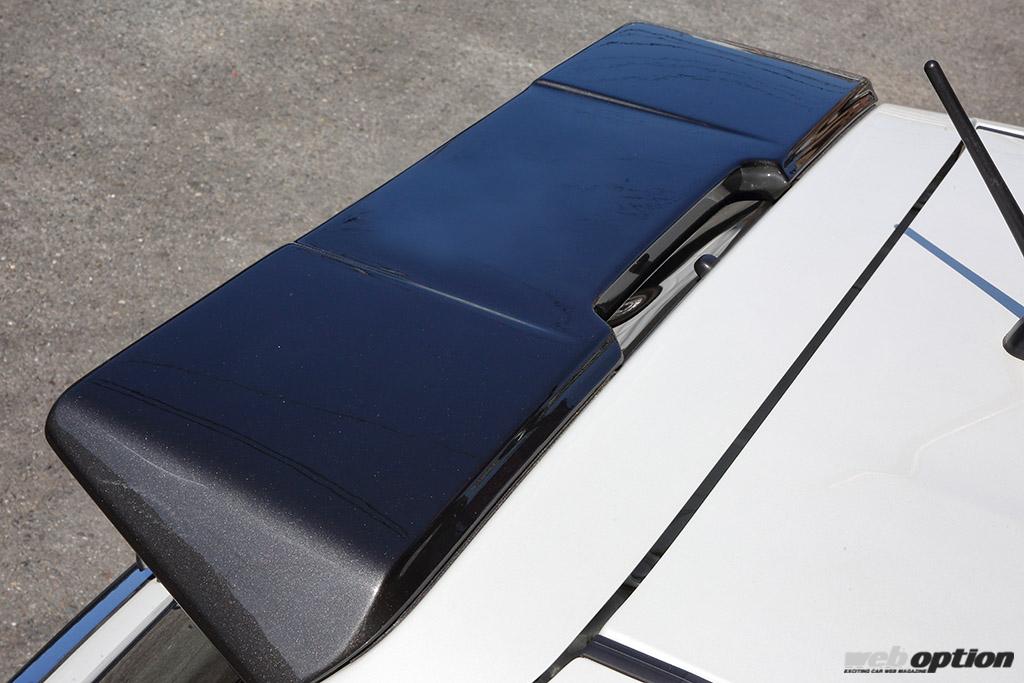 リヤにはスポーティなRSスポイラーをセット。純正ルーフエンドスポイラーとの交換タイプで、素材はカーボンで平織と綾織の2タイプを設定。保安基準にも適合する。