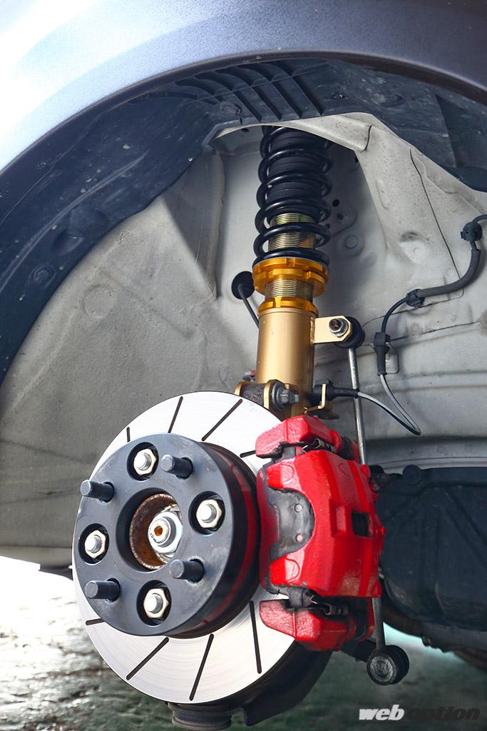 足回りは、オリジナルのGTSサスキットを中心にセットアップ。ストリートでの使い勝手も良い「程よい硬さ」と「しなやかさ」を併せ持った逸品だ。ブレーキはオリジナルのスリットローターが組まれる。