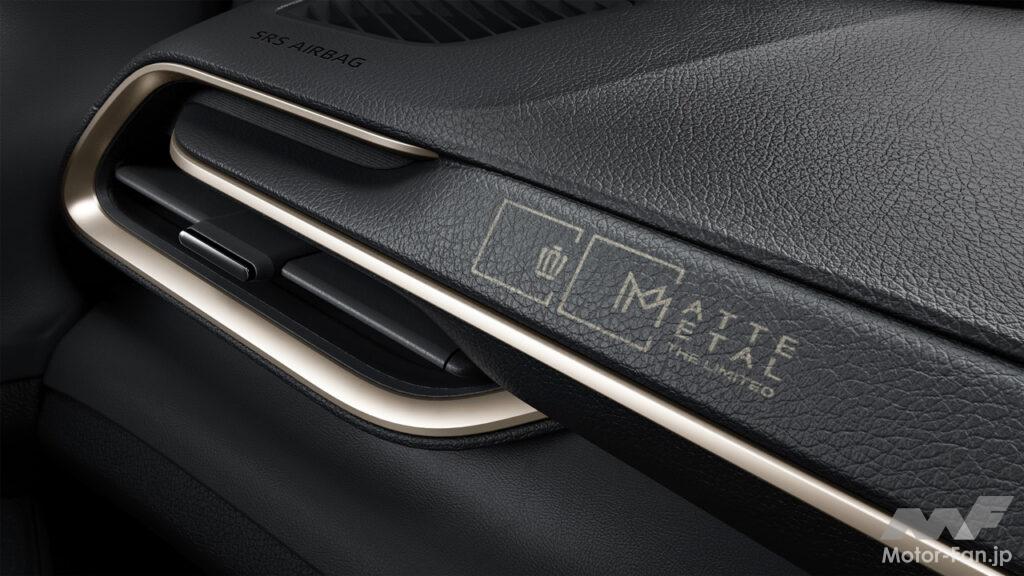 インテリアでは、インパネに『THE LIMITED-MATTE METAL』専用のレーザー加飾を刻印しているほか、ステアリングホイールにも専用加飾を施し、特別感を演出。ステアリングスイッチ周辺はウォームスティール、スポークはダークグレーメタル、ステッチはライトグレーだ。