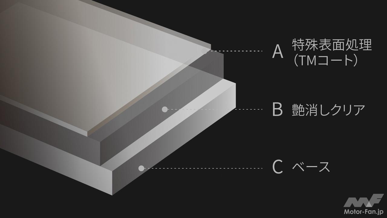ボディカラーのマットメタルは、塗料層の最表面にマット塗装の手入れを楽にする“特殊表面処理(TMコート)”を採用。匠の技術で薄膜かつ均一に仕上げ、マットの外観に影響を与えることなく、持久力のある防汚性・汚れ除去性を実現しているのが特徴だ。