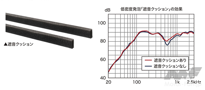 同梱される「遮音クッション」により、カースピーカー背面からの逆位相を遮へいして、特性の乱れを大幅に改善することで、中低域のクリアな再生を実現する。