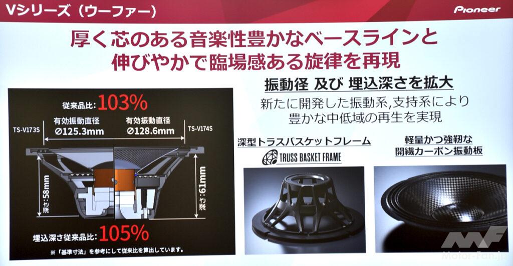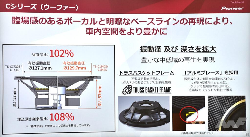 ウーファー部に、2層構造の「アラミドファイバーコーン」や剛性を高めて深型化した「トラスバスケットフレーム」を採用することで、メリハリのある中低域再生を実現。さらに「TS-C1740S/-C1746S/-C1740」は、振動板の有効振動径を大型化(従来比102%)することで、豊かで伸びのある低域再生を実現している。トゥイーター部には、軽量・高剛性で超高域再生を実現する「アルミニウム合金製バランスドドームダイアフラム」や、磁気回路から伝わった振動板の動きをより正確に制御する「ポリウレタンコートエッジ」を採用した。