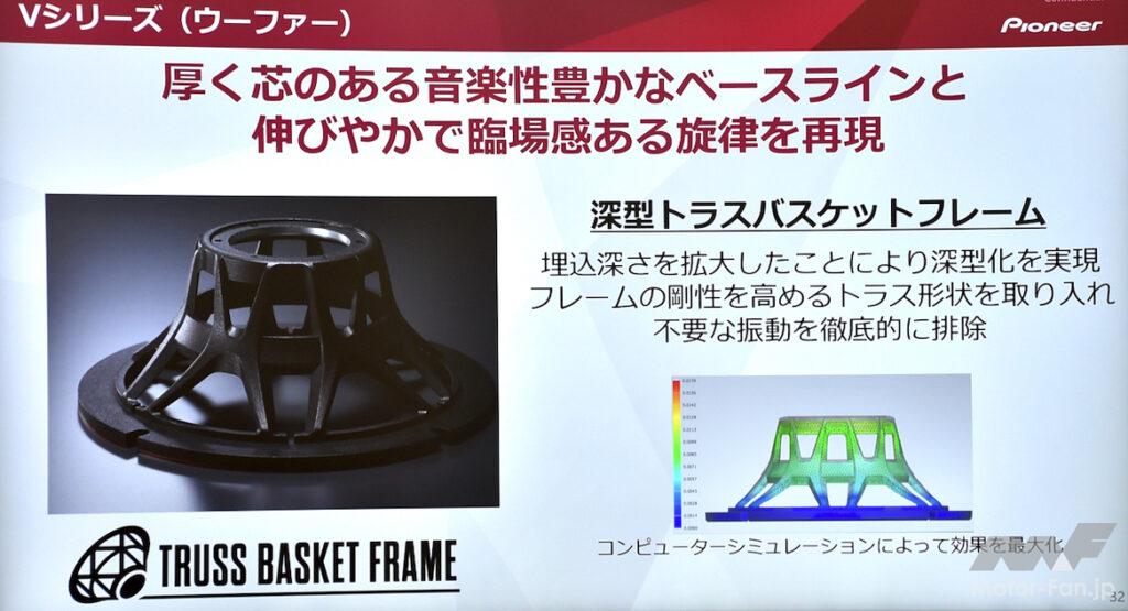 ウーファー部の振動板の有効振動径を大型化(従来比103%)し、剛性を高めて深型化した「トラスバスケットフレーム」を採用するとともに、新開発の磁気回路で有効振幅量を従来比150%まで拡大することで、メリハリのある豊かな中低域再生を実現。トゥイーター部には、高いヤング率と内部損失を併せ持つ広指向特性の「チタン製バランスドドームダイアフラム」を採用し、豊かな音場と伸びやかで美しい高音再生を実現した。