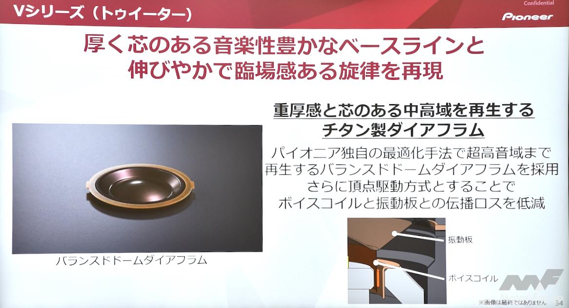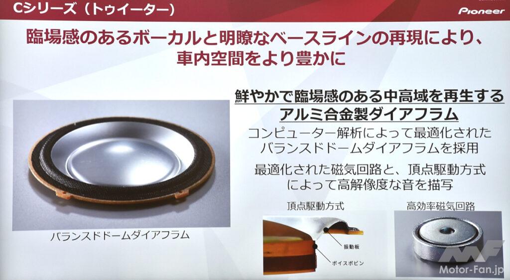 パイオニアのサウンドコンセプトは「音楽をありのまま表現する」ことにある。信号の変化に忠実であることはもちろん、広帯域への対応、不要振動の排除、低音域から可聴帯域を超える高音域まで質感高く再生する。さらに楽曲に込められた緻密なニュアンスまでも忠実に再生。
