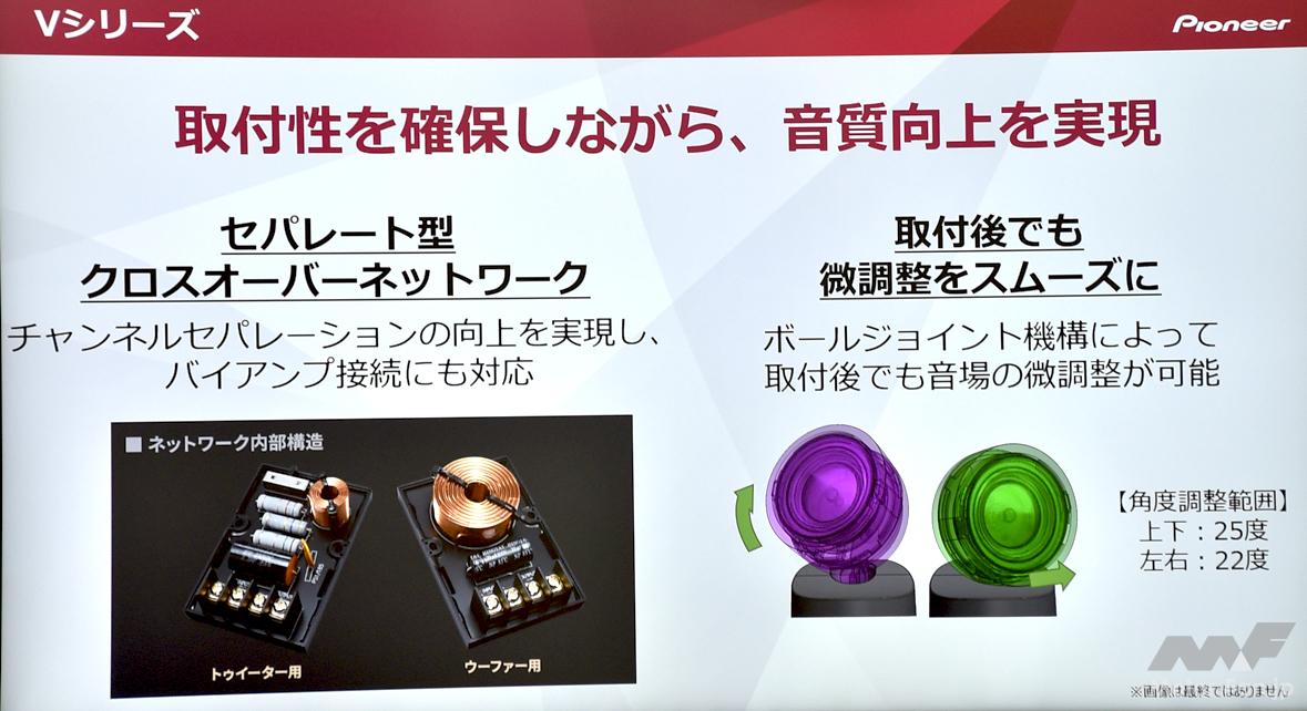 緻密な音の描写と臨場感を実現し、ハイレゾ音源の再生にも対応するのはもちろん、「TS-T940」「TS-T740」は取付け後でも、車室内の形状や取付位置に合わせて最適な向きに角度調整が可能になっている。取付性を考慮した専用「クロスオーバーネットワーク」を同梱している。