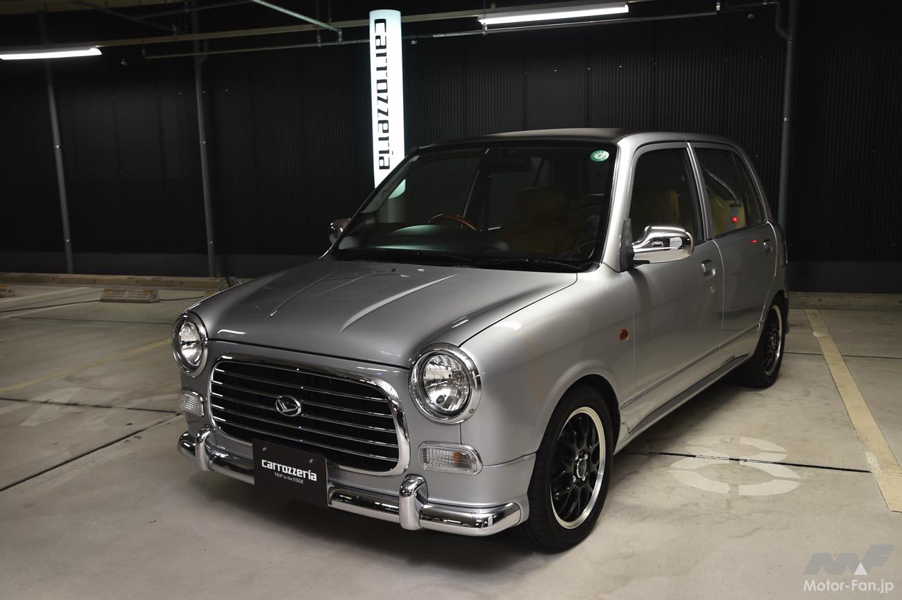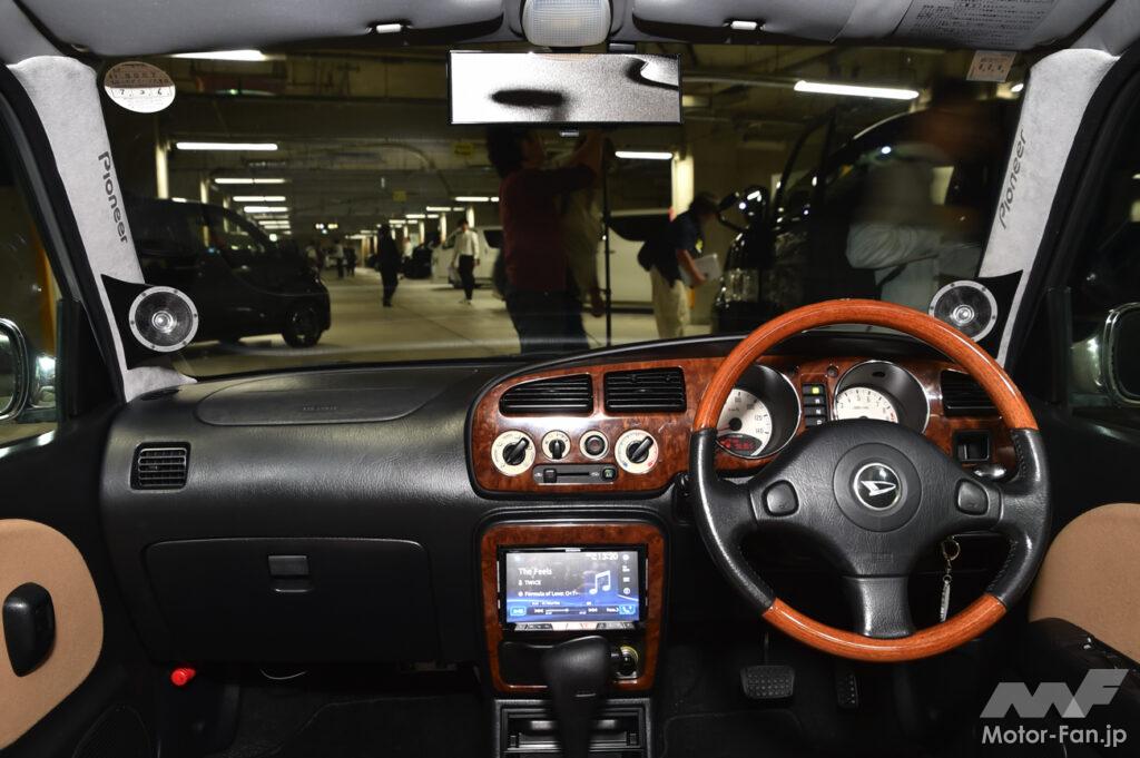 ヘッドユニットはカロッツェリアの2DIN、ドア内スピーカーも当然カロッツェリアに交換済み。特に目立つのが左右Aピラーにセットされたトゥイーター。後付け感はあるものの収まりは良く、スエード調のロゴ入りピラーカバーと相まって仕上がりは上々。ウッド加飾やタンレザー調のシートといい、軽自動車とは思えぬインテリアだ。