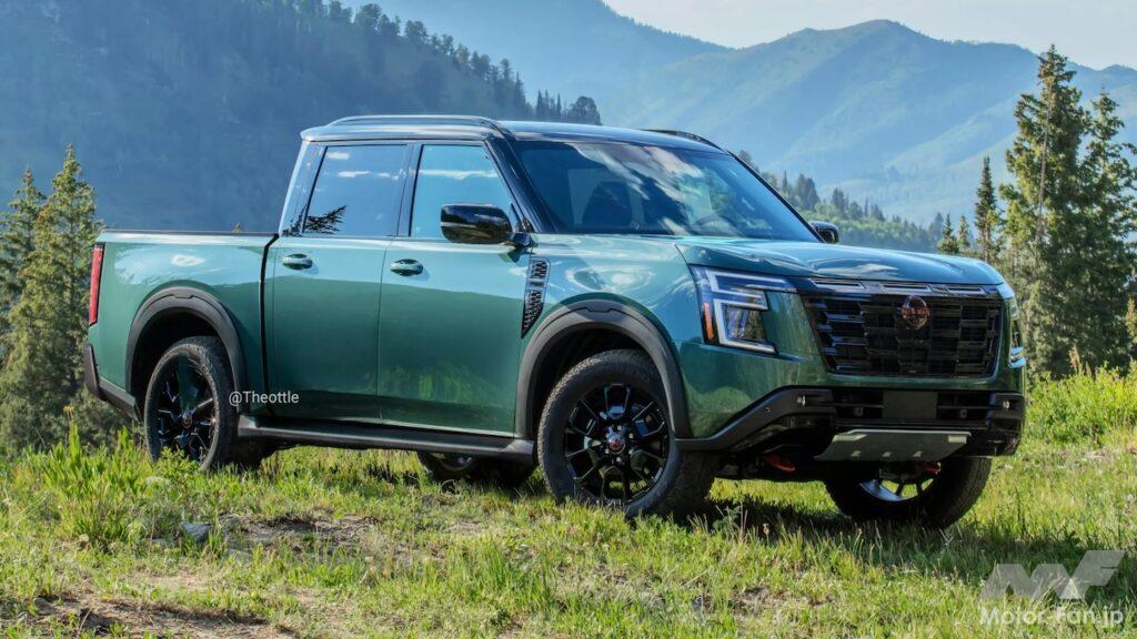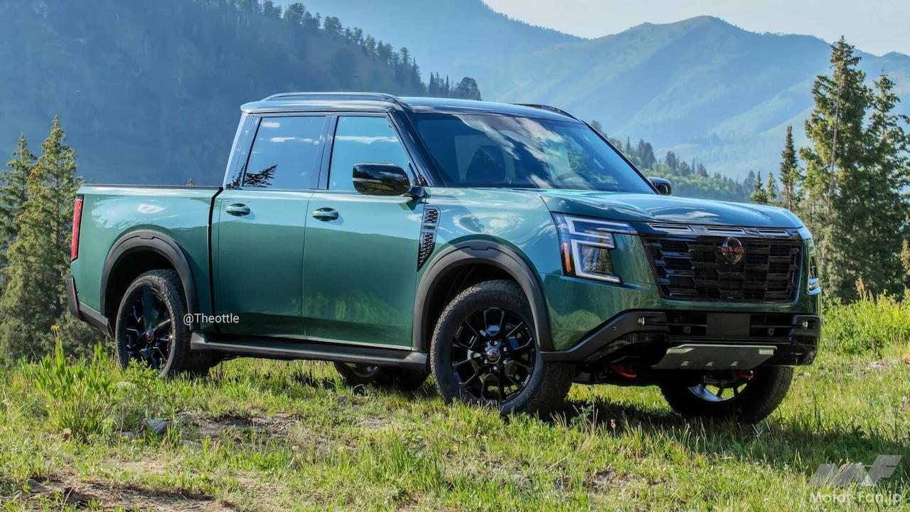 独立系CGアーティスト、Theottle氏から提供された予想CGは、最新アルマーダのデザインの特徴を巧みに維持しながら、タイタンのスタンスを模倣している。グリーンハウスを長くし、ホイールベースとリアオーバーハングの両方を延長、後部に十分なサイズのベッドを備えたデュアルキャブセットアップを実現している。