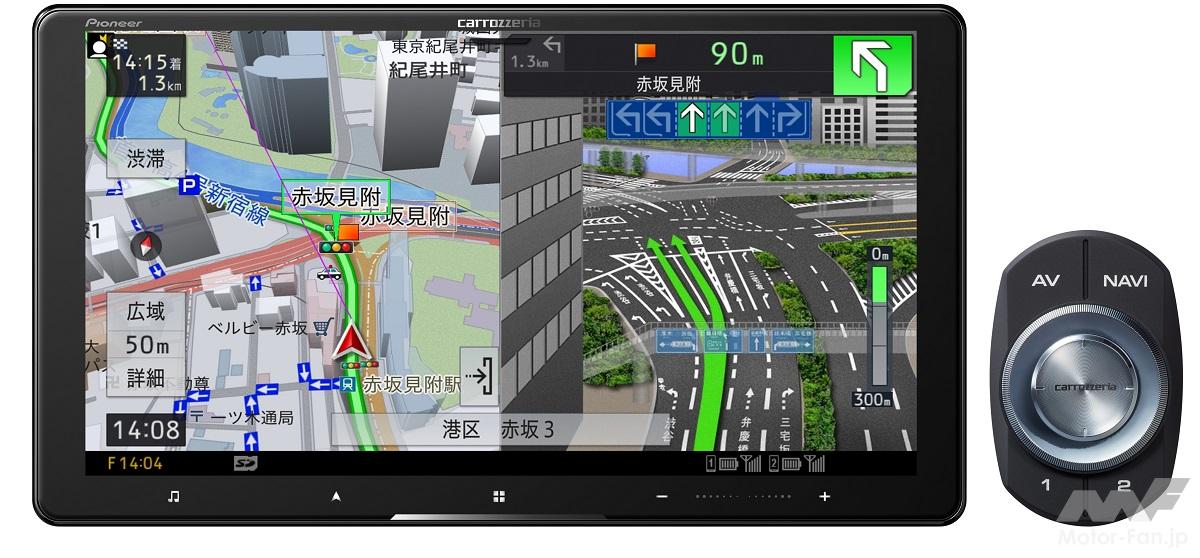 - ボリューム変更やナビ/AV画面の切換え、地図のスケール変更やソース切換えなどの基本操作が可能な「スマートコマンダー」を同梱。