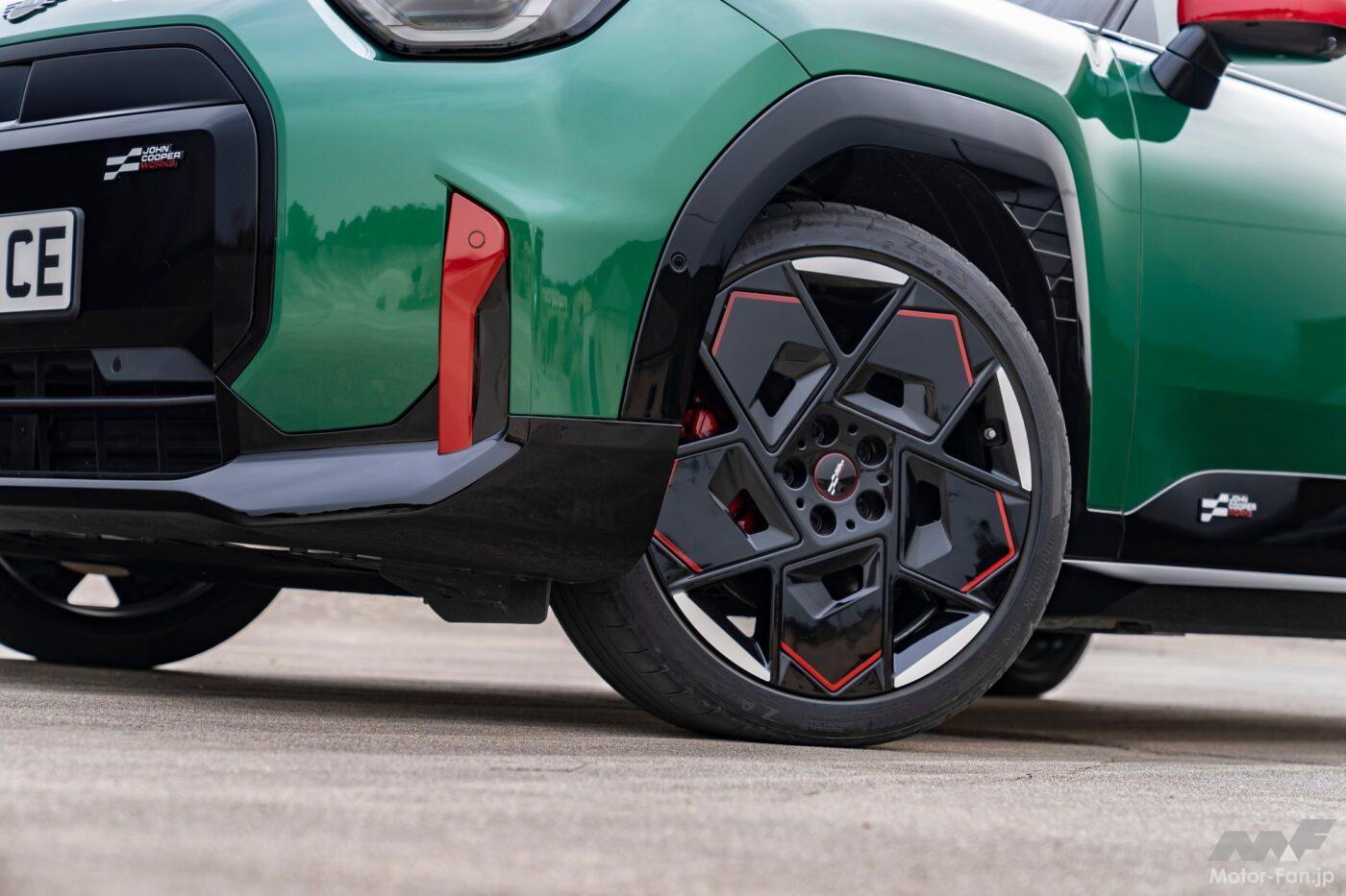 MINIのパフォーマンスへのこだわりは、フルエレクトリックモデルでも健在だ。モータースポーツのチェッカーフラッグを彷彿させるレッド、ホワイト、ブラックのJCWロゴが高光沢ブラックの八角形フロント・グリルを飾る。LEDヘッドライトのデイタイム・ランニングライトには「JCWシグネチャー」の水平バーが組み込まれ、パフォーマンスを予感させる表情に仕上げられている。空力特性を最適化させたホイールデザインはJCWエレクトリックが18インチ、JCWエースマンが19インチ専用で装備されている。