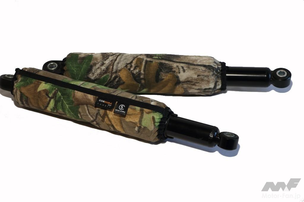 装着方法はリヤショックに巻き付けた後、付属のインシュロックで上下を絞るだけと1分もかからない。カスタムパーツというと樹脂や金属のイメージが強いけれど、アパレルやキャンプギアなどにも使用される素材を取り入れることで車体に変化をつけられる。